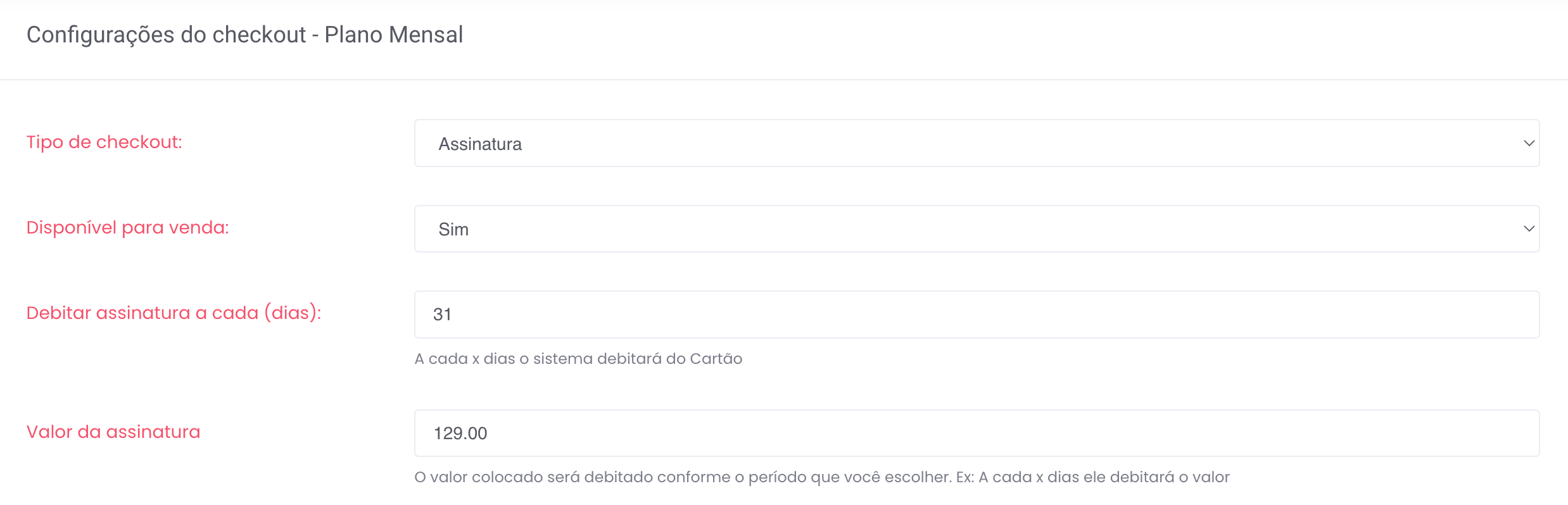 Aqui o tipo de checkout padrão é Assinatura e atente-se ao período de débito da assinatura, sempre considere os meses com 31 dias para definir períodos maiores que 31 dias (Exemplo: Assinatura Trimestral = 93 dias).