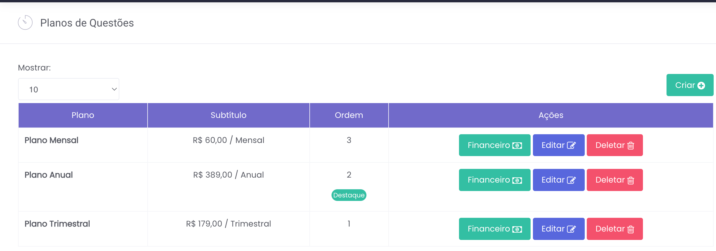 Aqui você visualiza a lista de planos cadastrados, podendo criar novos, excluir, editar e deletar os planos.