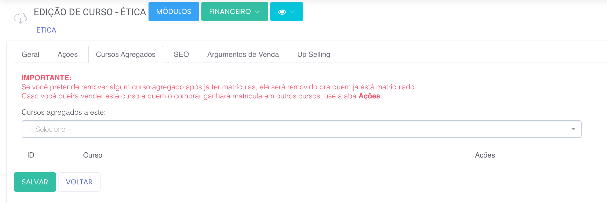 Após o cadastro do curso aparecerá uma chamada cursos agregados, nela você seleciona os cursos que você quer que pertença a este combo.
