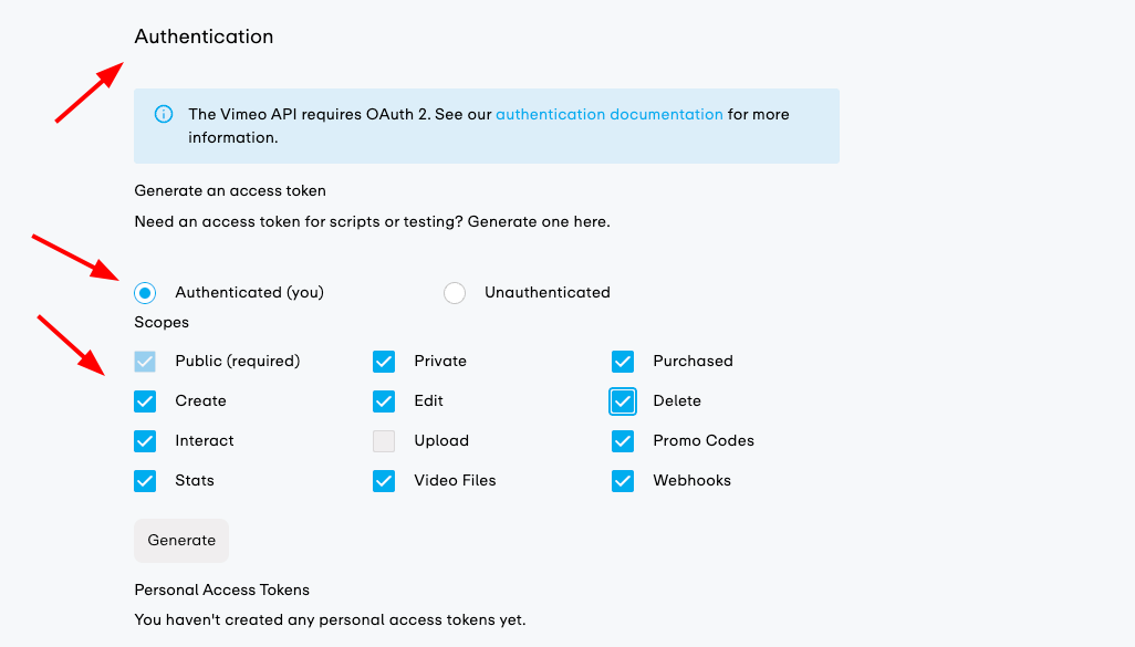 Após criar o app, vá na sessão Authentication, marque a opção Authenticated e marque as caixinhas conforme abaixo, após isso clique em generate.
