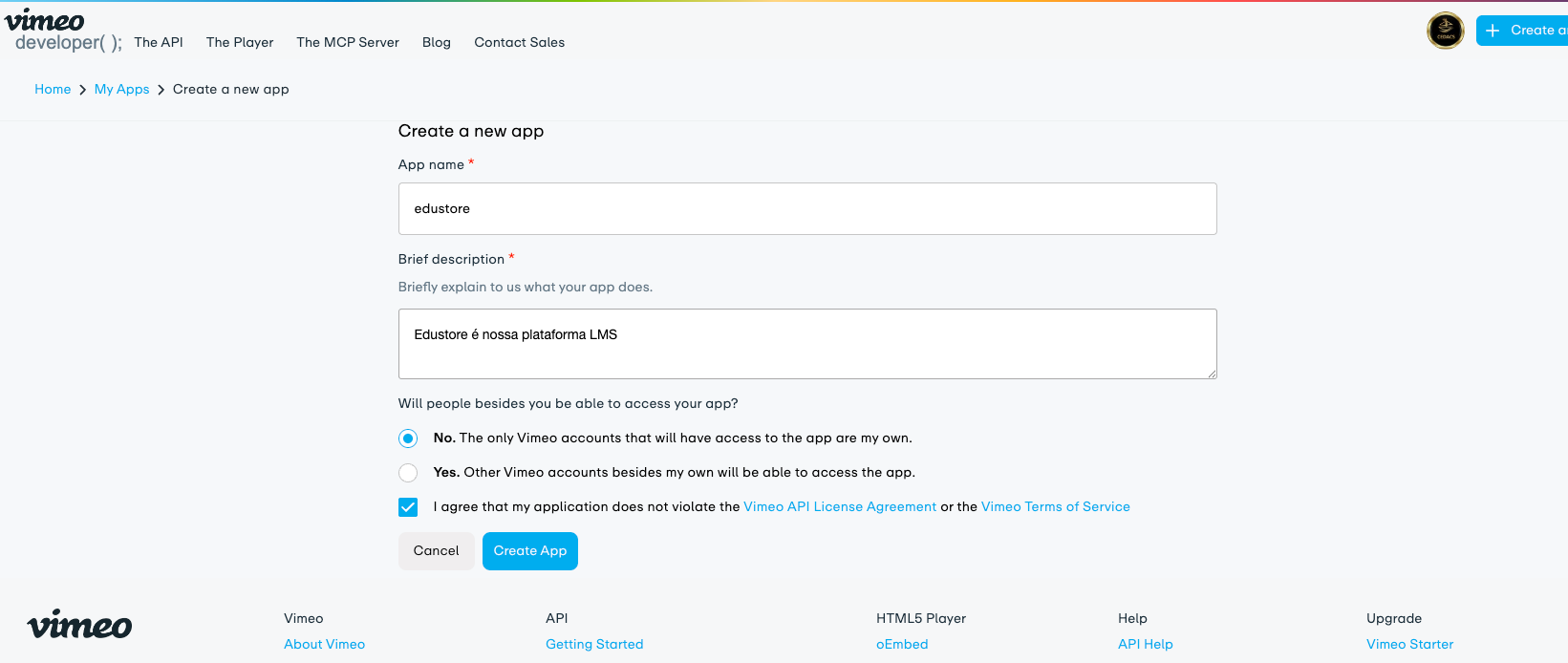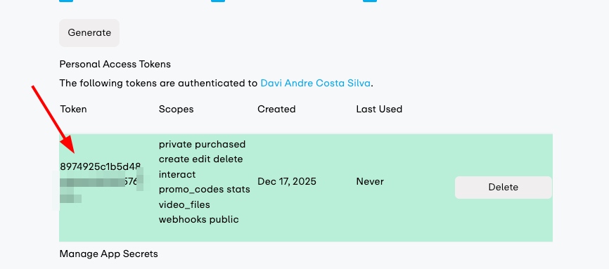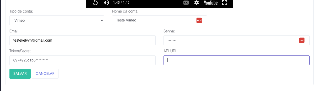 Copie o token gerado e cole no cadastro da Contas de Vídeo na EduStore: