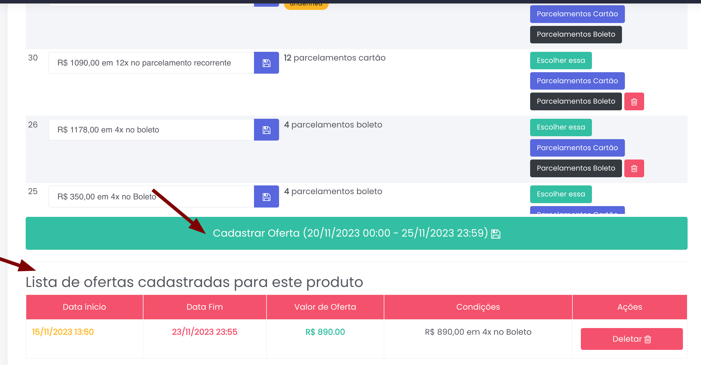 No exemplo acima está sendo configurado um período de oferta de 5 dias (de 20/11 à 25/11), com o valor promocional de R$ 900,00 e abaixo você consegue selecionar as condições de parcelamento (Boleto Parcelado e Cartão Recorrente).