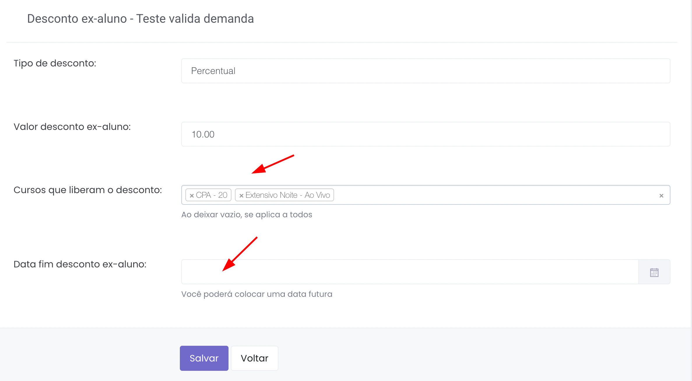 Aqui você define desconto para ex-alunos, podendo escolher quais cursos eles precisam ser ex-alunos/alunos para receber o desconto (tem que estar matriculado a pelo menos 30 dias).