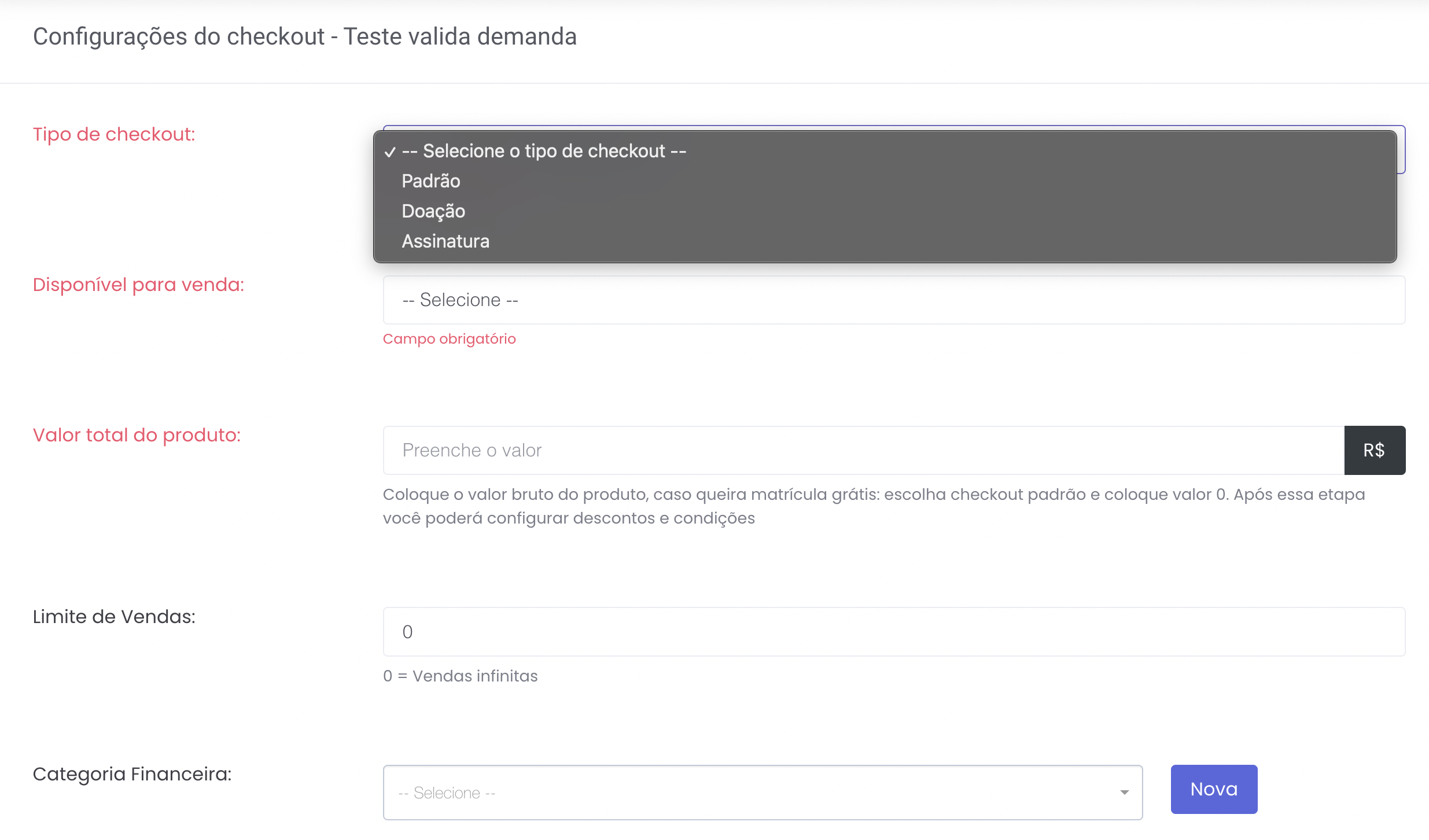 Os campos em vermelho são obrigatórios e o principal campo é o tipo de checkout onde você irá escolher o formato de venda: