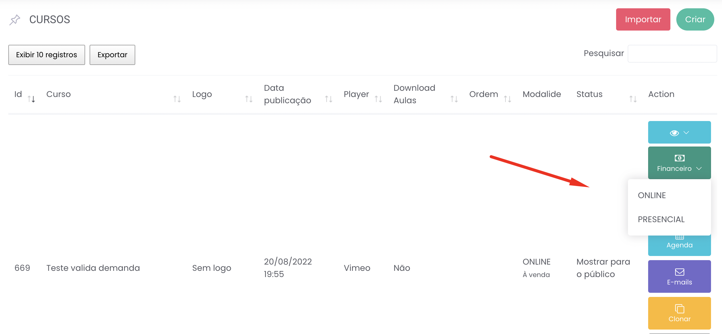 Em Acadêmicos → Cursos, vá até o curso que deseja disponibilizar para venda e cliquem em Financeiro → Online: