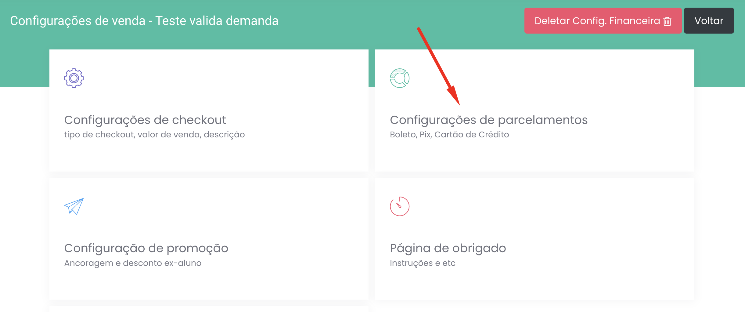 Após salvar essa primeira etapa, as demais serão desbloqueadas e nosso próximo passo é a configuração de parcelamentos:
