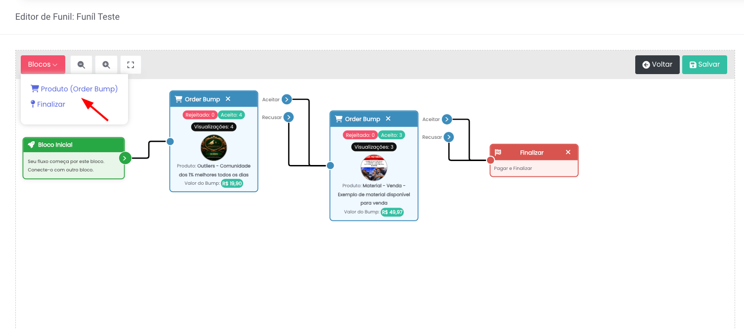 Todo o funil começa com o bloco início e obrigatoriamente precisa ter um bloco Finalizar, para o algoritmo entender quando deve ir para os meios de pagamento.