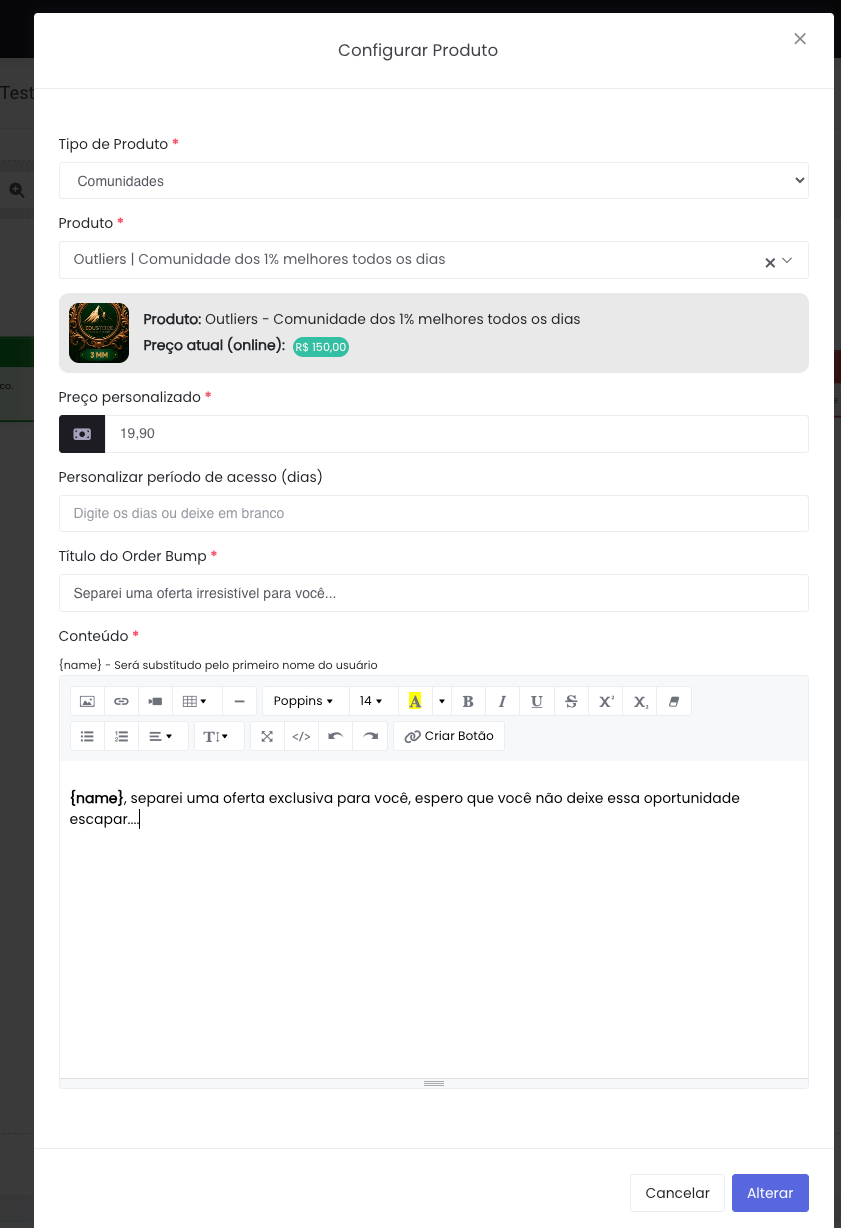 Atente-se ao campos obrigatórios marcados com o * e precisamos também ao campo Personalizar período de acesso, nesse caso seria para comunidades, na qual, por padrão possuem um tempo de acesso, mas você pode ofertar outro período de acesso no Order Bump, seja menor ou maior do que o que está cadastrado na comunidade.