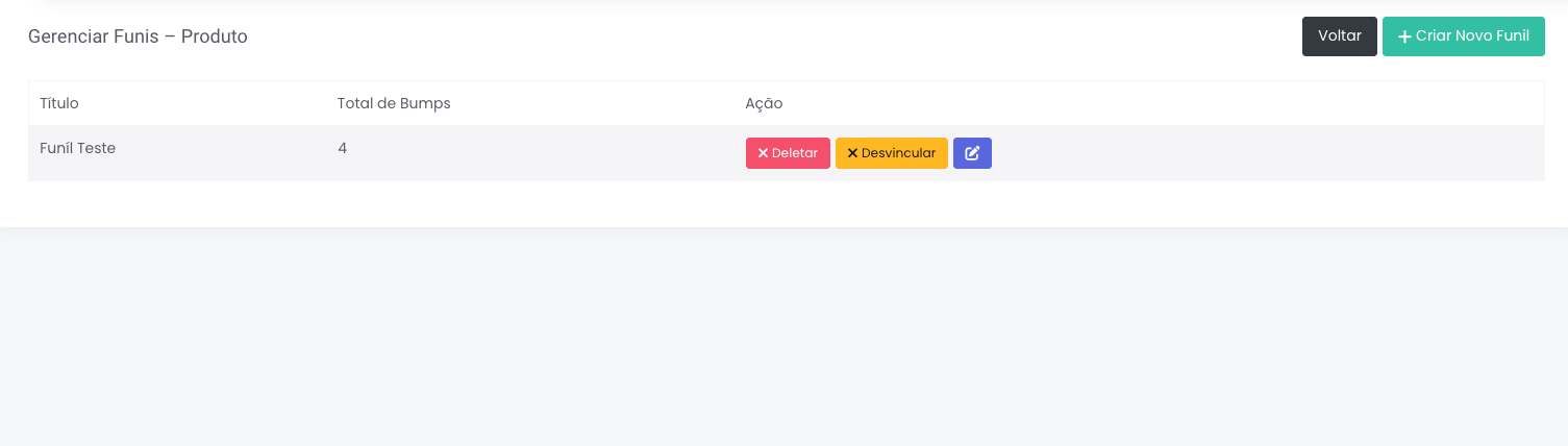 Acesse a opção Funís, lá você verá todos os funis já cadastrados e poderá reutilizá-los nos produtos ou criar um novo para o produto ao qual você está.