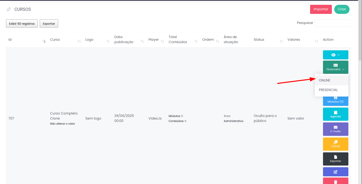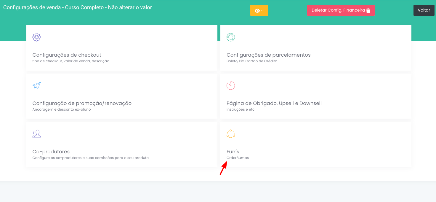 Acesse a configuração financeiro do seu produto (Seja Curso ou Material), conforme exemplo abaixo: