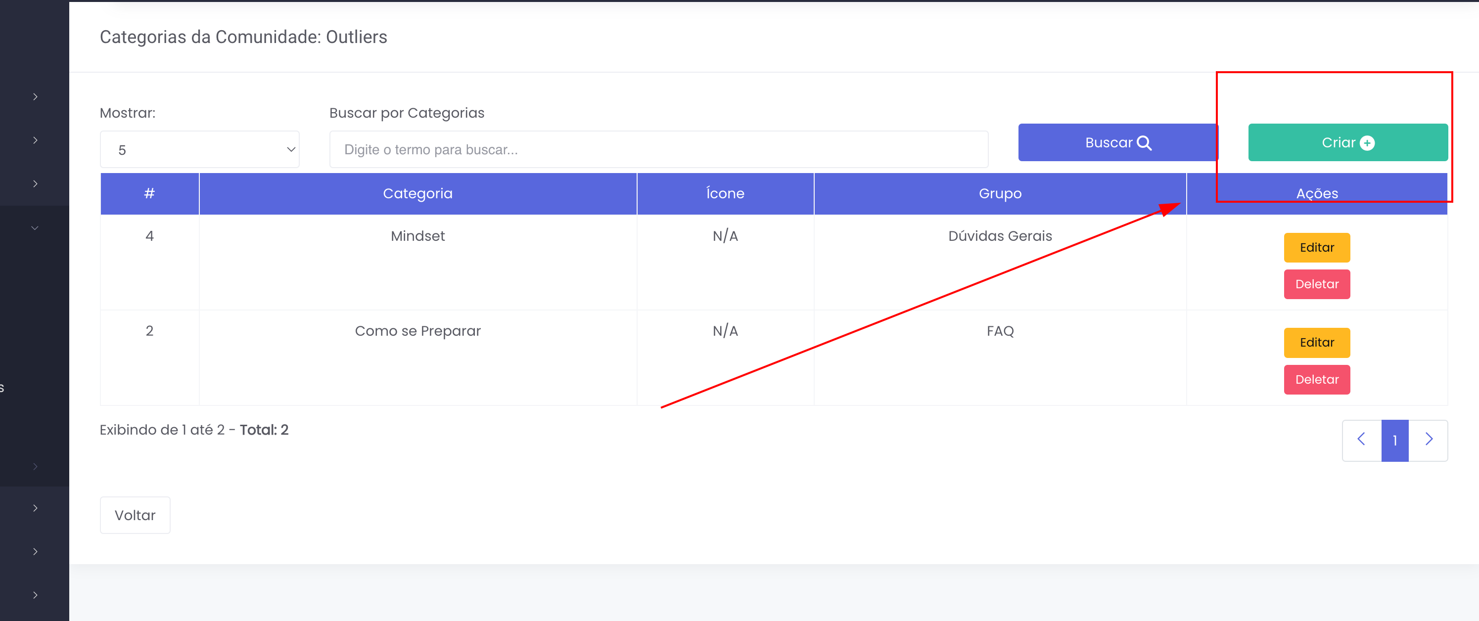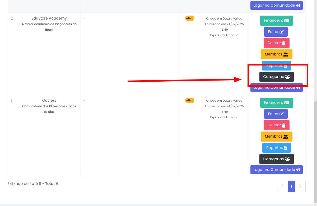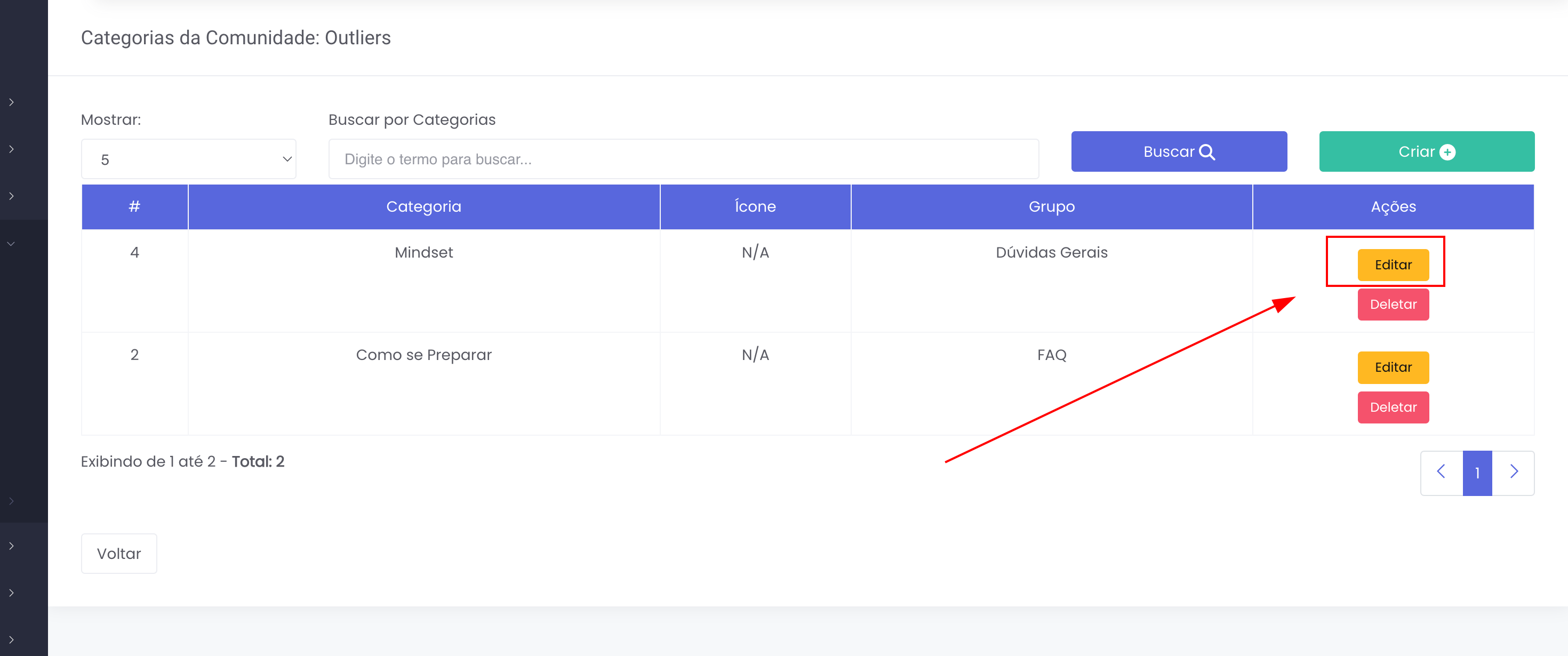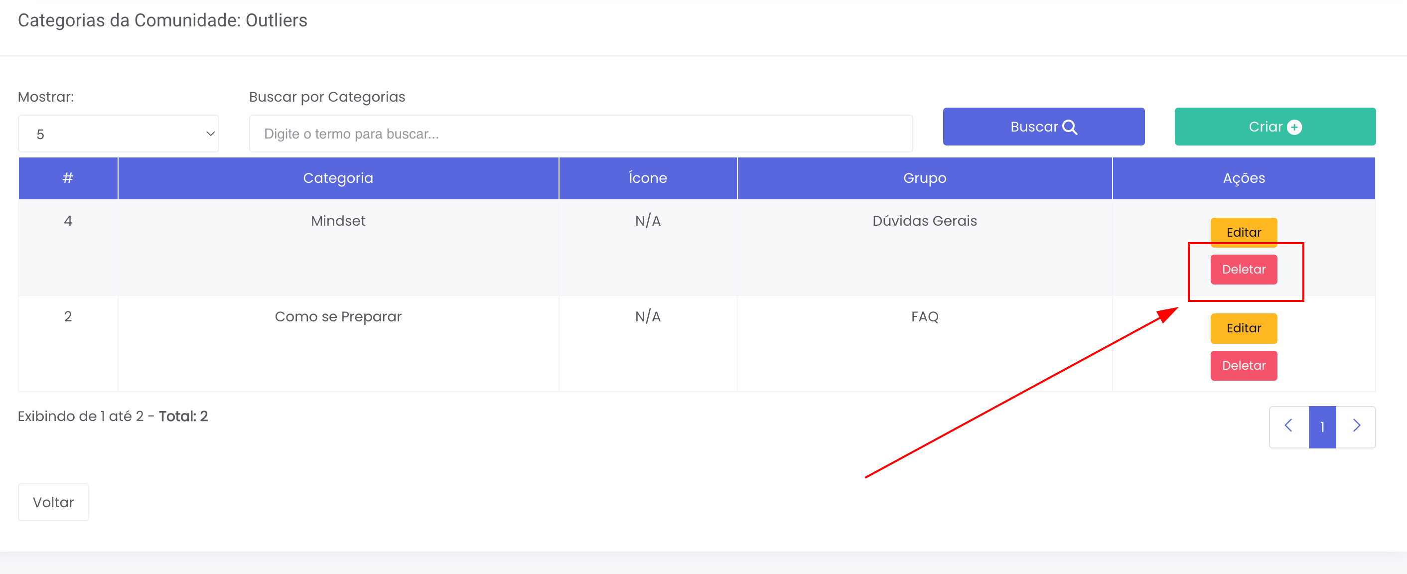 Para remover uma categoria, de uma comunidade basta selecionar o Deletar dentro de Ação:
