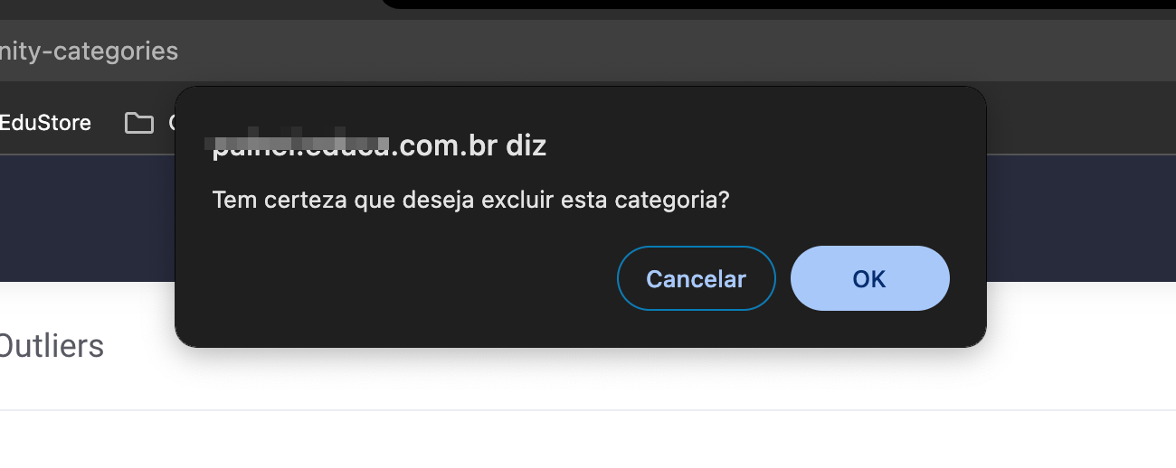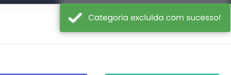 Após clicar em "OK", irá aparecer a mensagem Categoria excluída com sucesso!, indicando que deu certo a remoção.