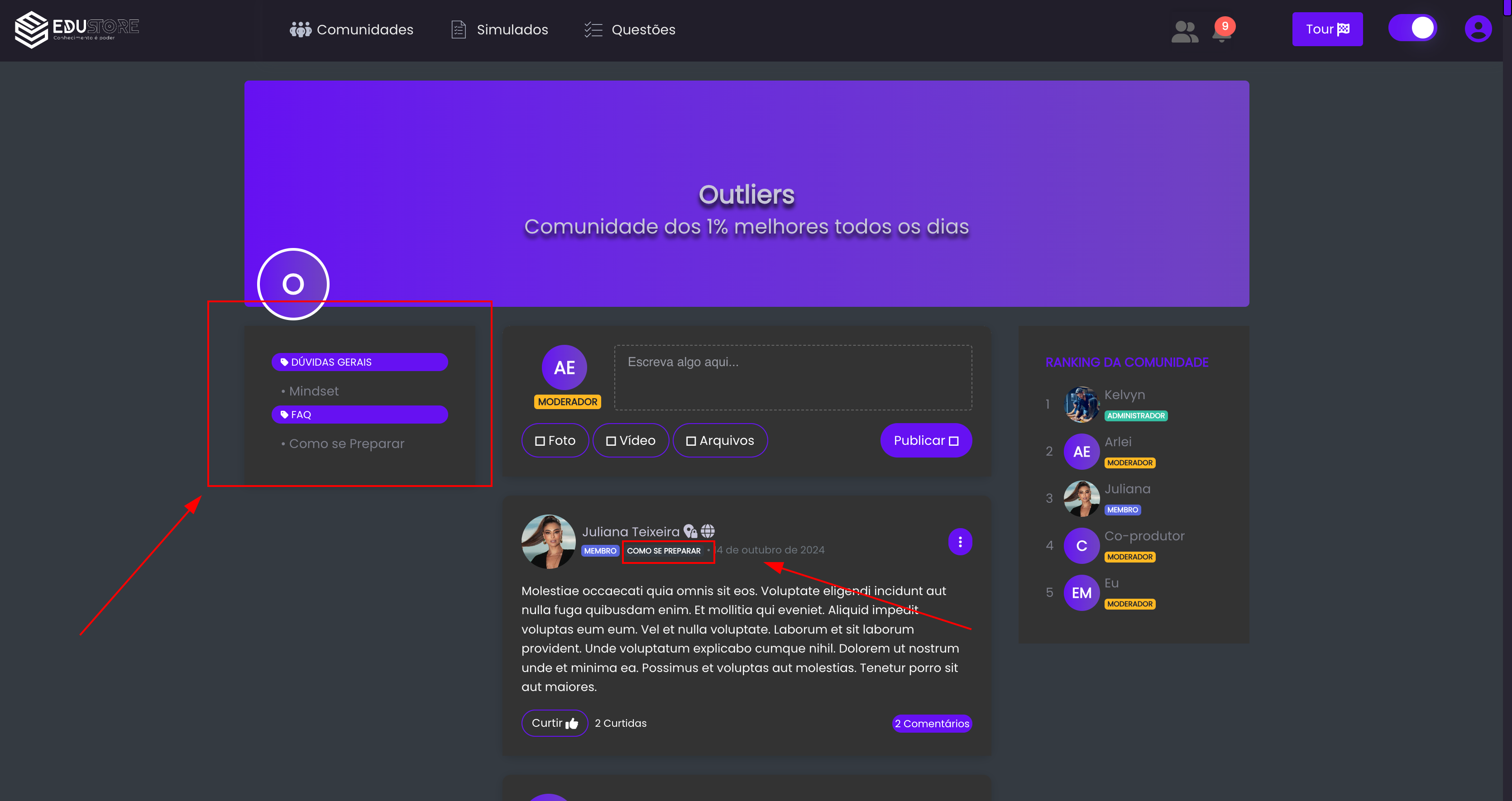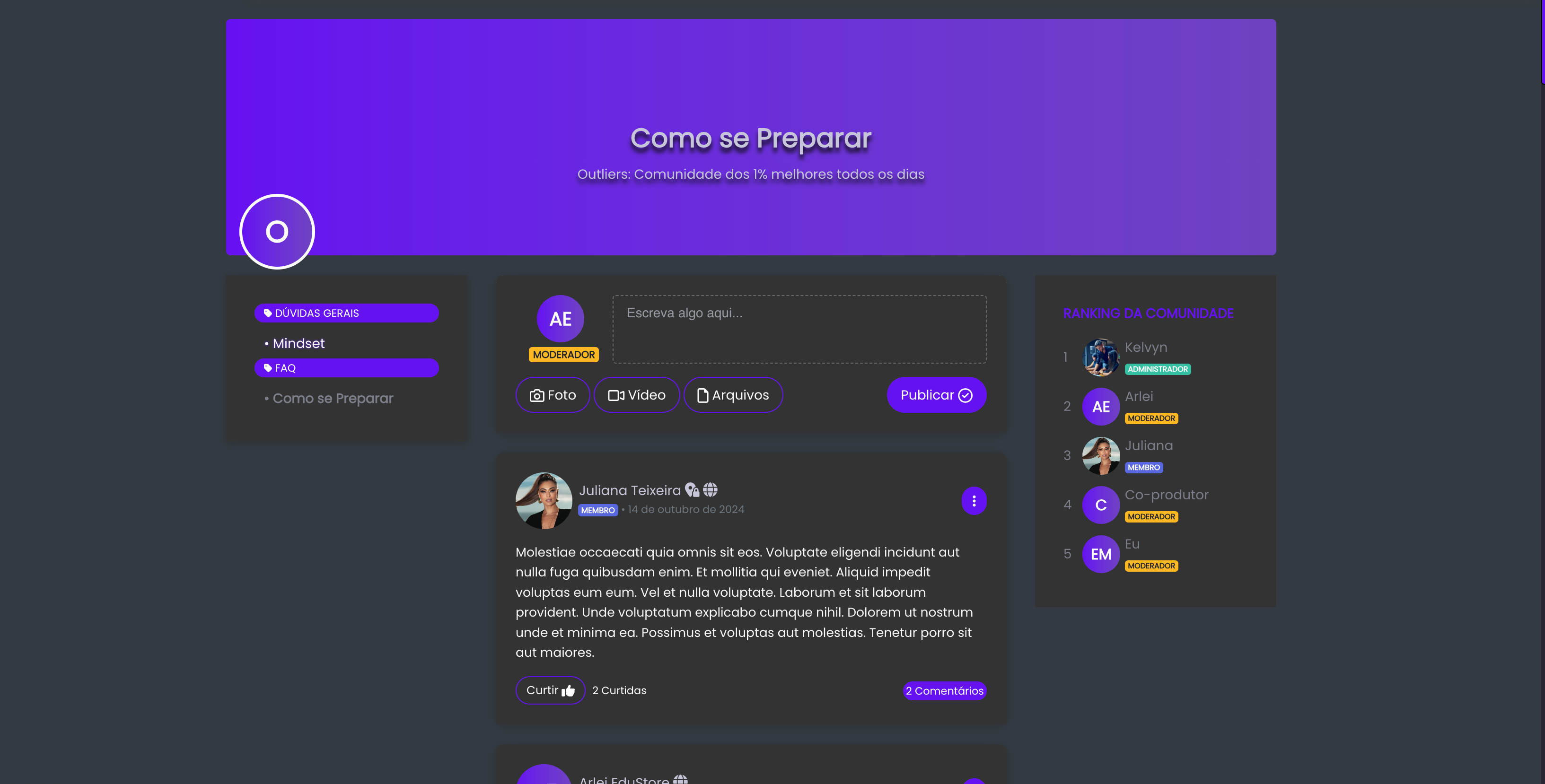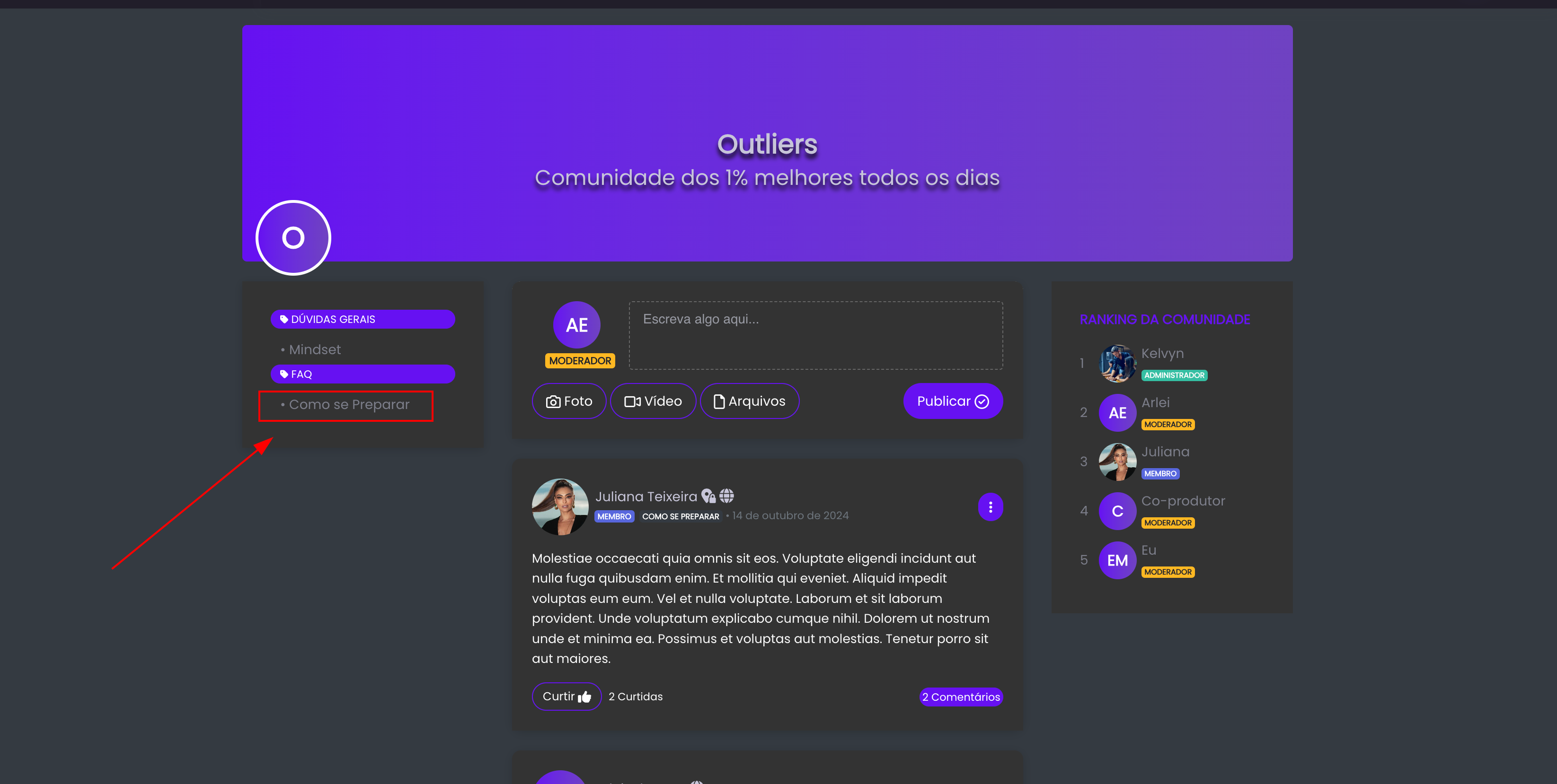 Agora vamos explorar como o aluno visualiza essa aplicação na prática. No lado superior esquerdo, logo abaixo do avatar da comunidade, estão listadas as categorias e seus respectivos grupos. Essas categorias organizam o conteúdo, tornando a navegação mais intuitiva.