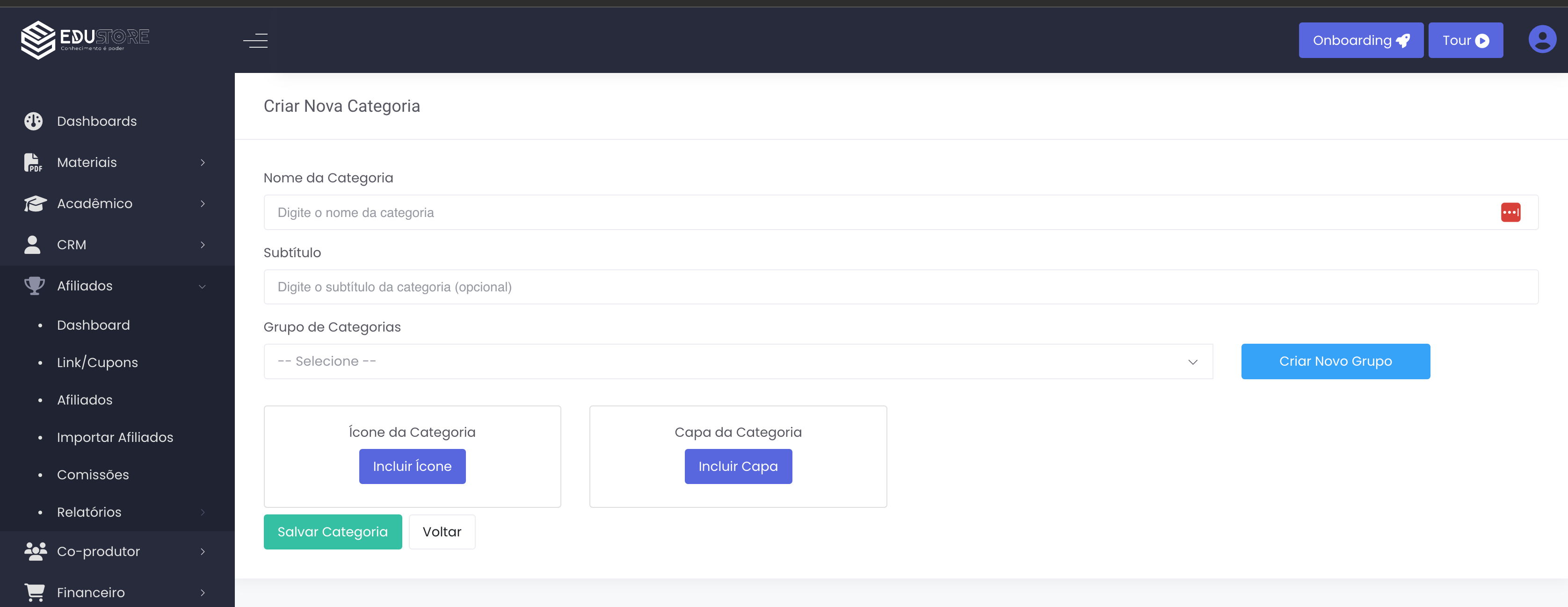 - Ao criar uma nova categoria, é possível definir o nome, selecionar um ícone representativo e associá-la a um grupo específico.