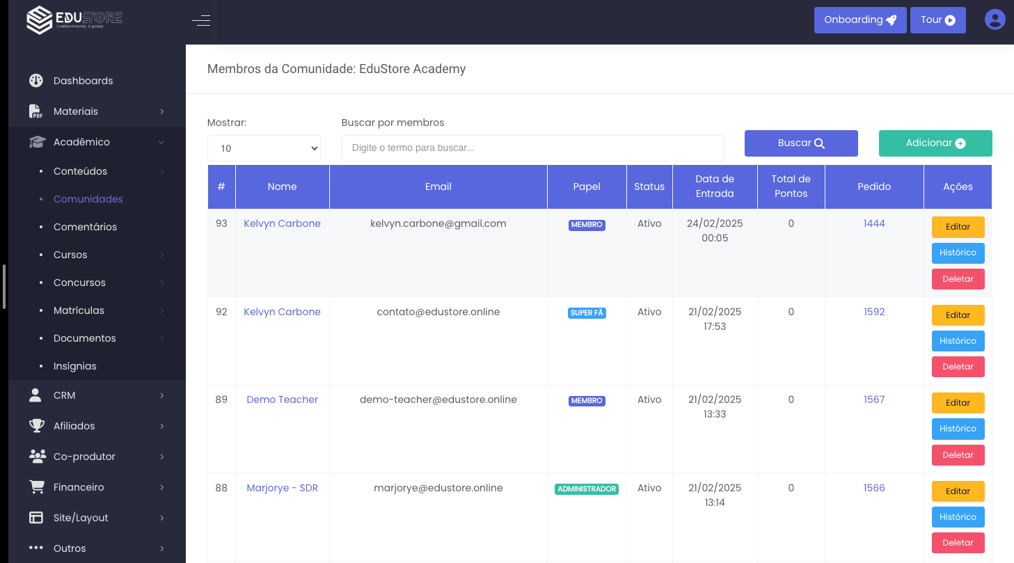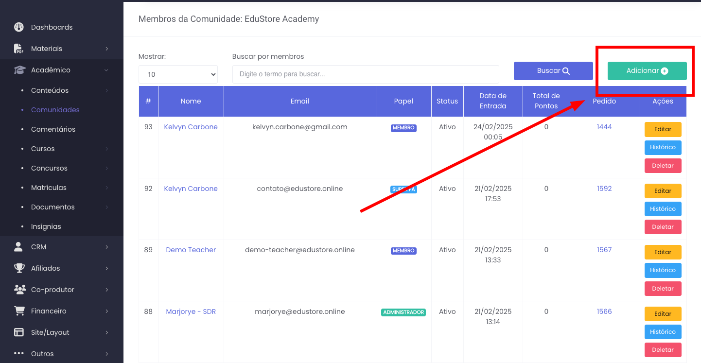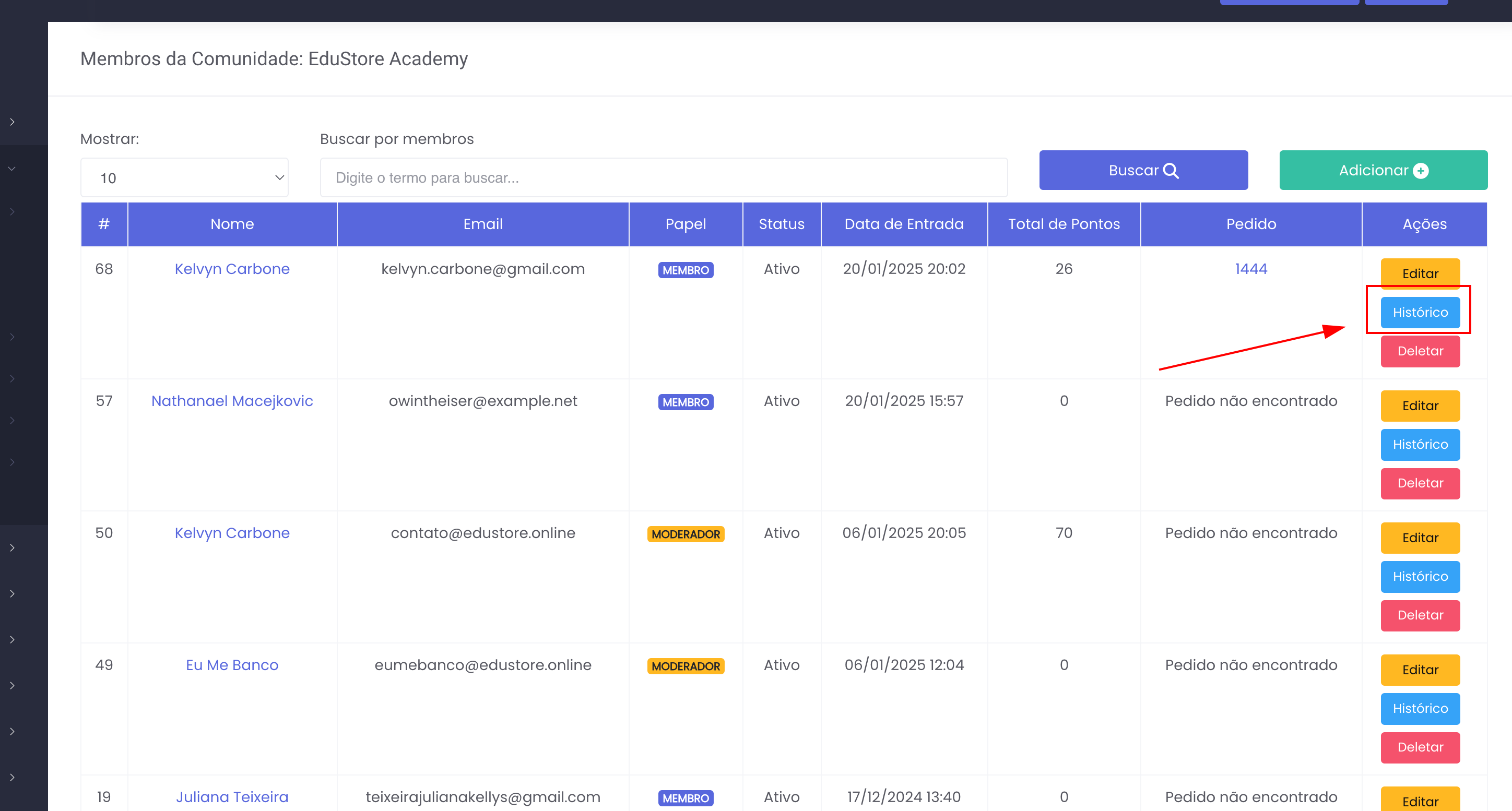 Gerenciando Comunidade: Adicionando, Editando, Histórico e Excluindo Membros da Comunidades