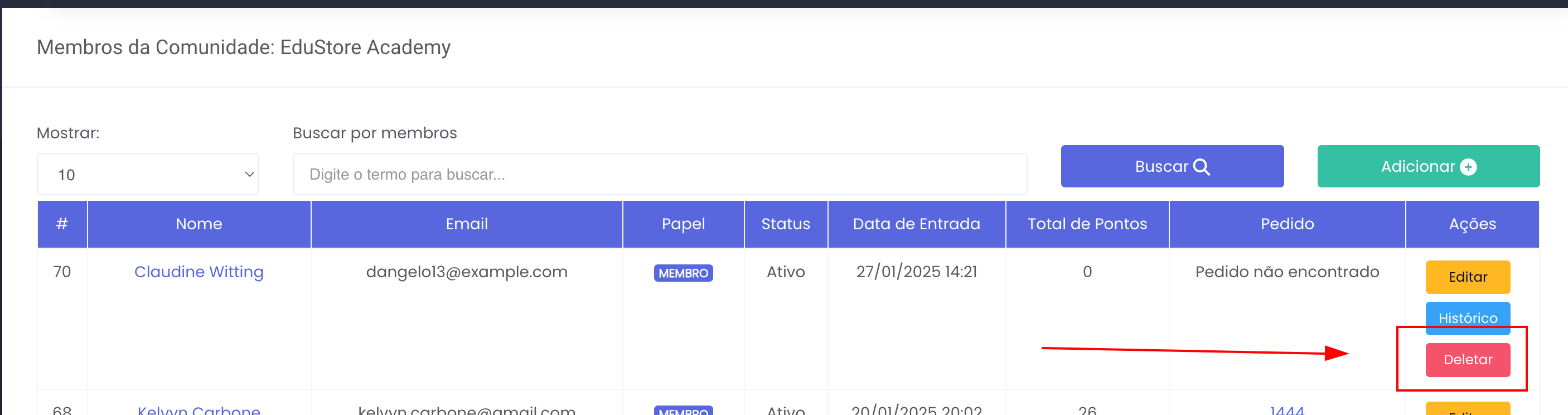 Para fazer a exclusão do membro, basta clicar em Deletar: