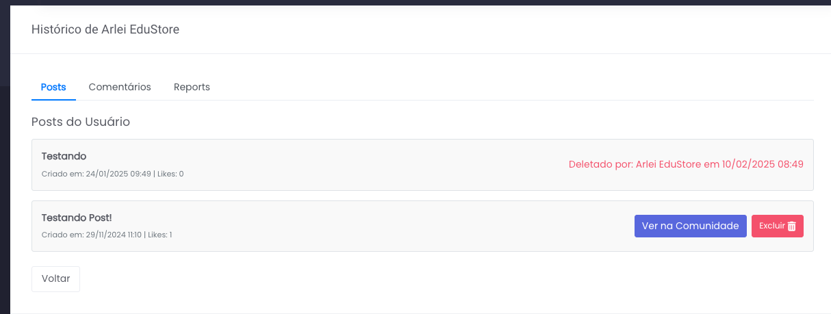 - Botão "Ver na Comunidade": Link direto que redireciona o administrador para a visualização do post dentro da comunidade, permitindo acesso rápido e prático.