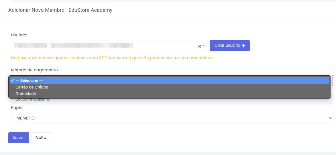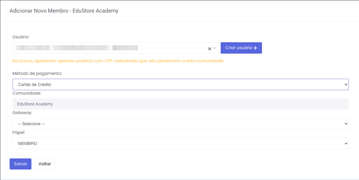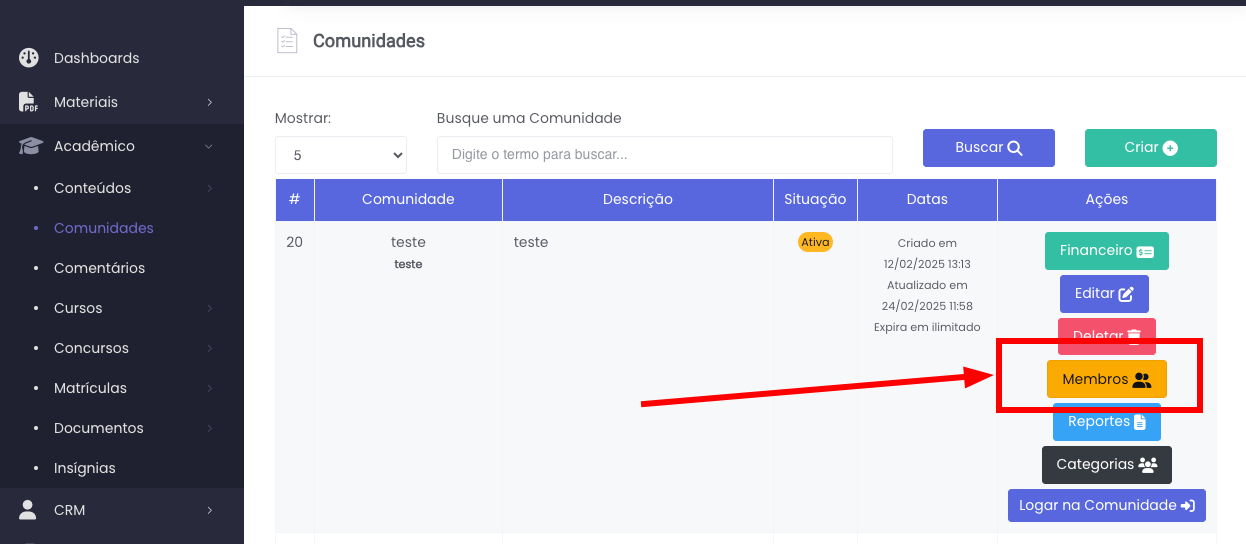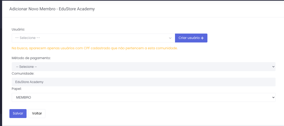 - Salvar: Finaliza o cadastro do membro na comunidade. Certifique-se de preencher todos os campos corretamente antes de clicar neste botão.