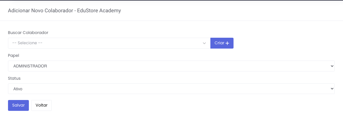 A principal diferença nesse caso é a presença de apenas duas opções de papel para cadastro do colaborador: