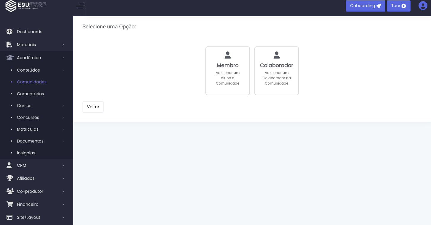 Ao selecionar a opção Colaborador, o ingresso na comunidade ocorre de forma simplificada, ideal para funcionários ou membros internos.