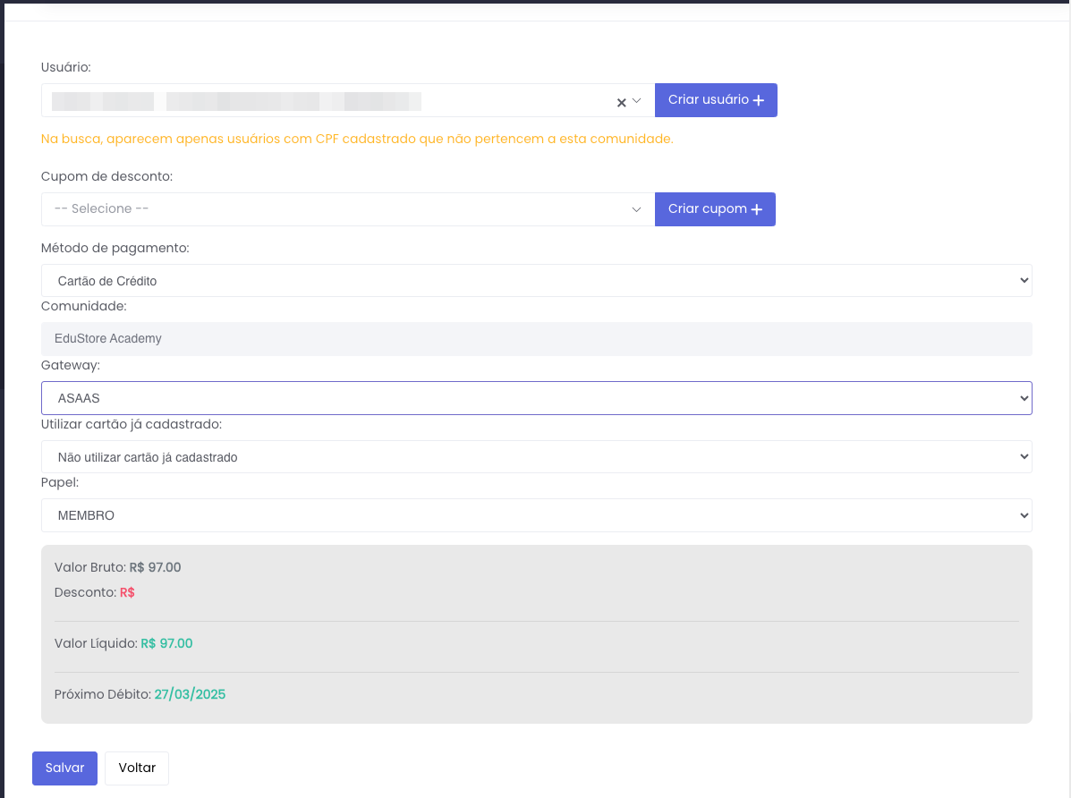 - Desconto Aplicado: Caso haja um cupom , o valor da comunidade será ajustado automaticamente.