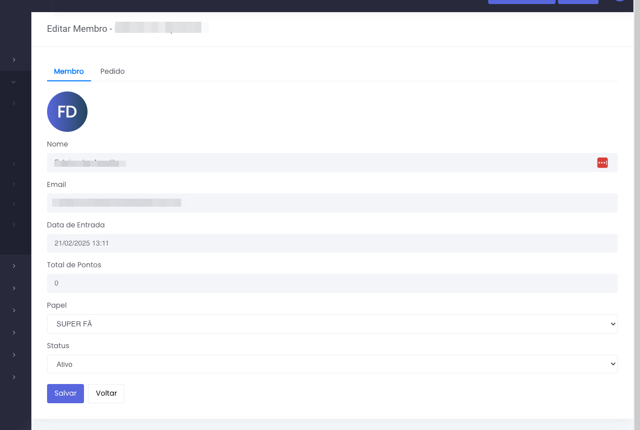 Para colaboradores, como não há um pedido associado, a interface é simplificada, apresentando apenas a aba Membro, sem exibir a aba de Pedido. Isso garante uma experiência mais objetiva e adaptada ao tipo de usuário.