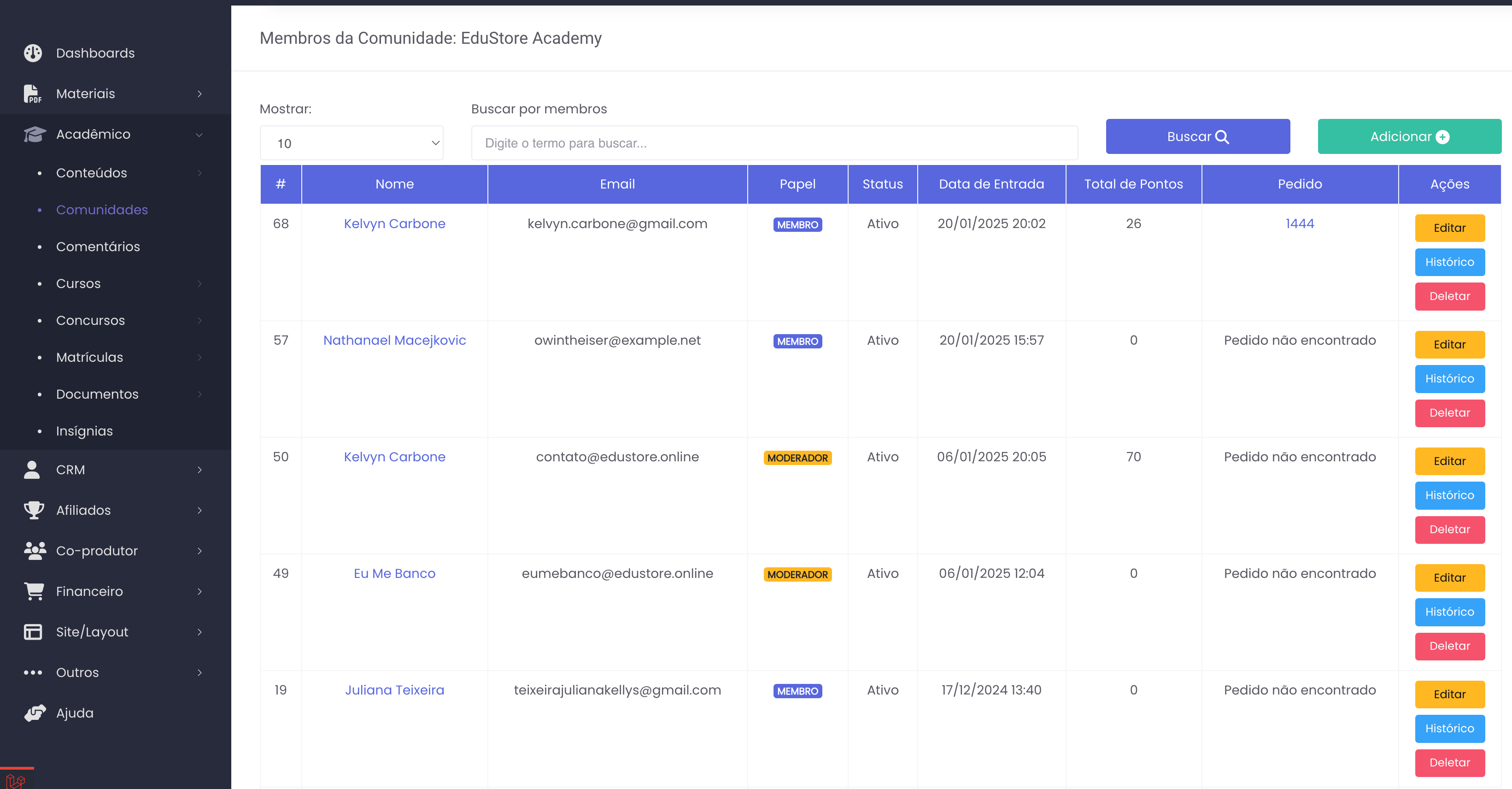 A tabela de Lista de Membros exibe as principais informações de cada membro da comunidade de forma clara e detalhada. Abaixo estão os ajustes aplicados aos campos apresentados: