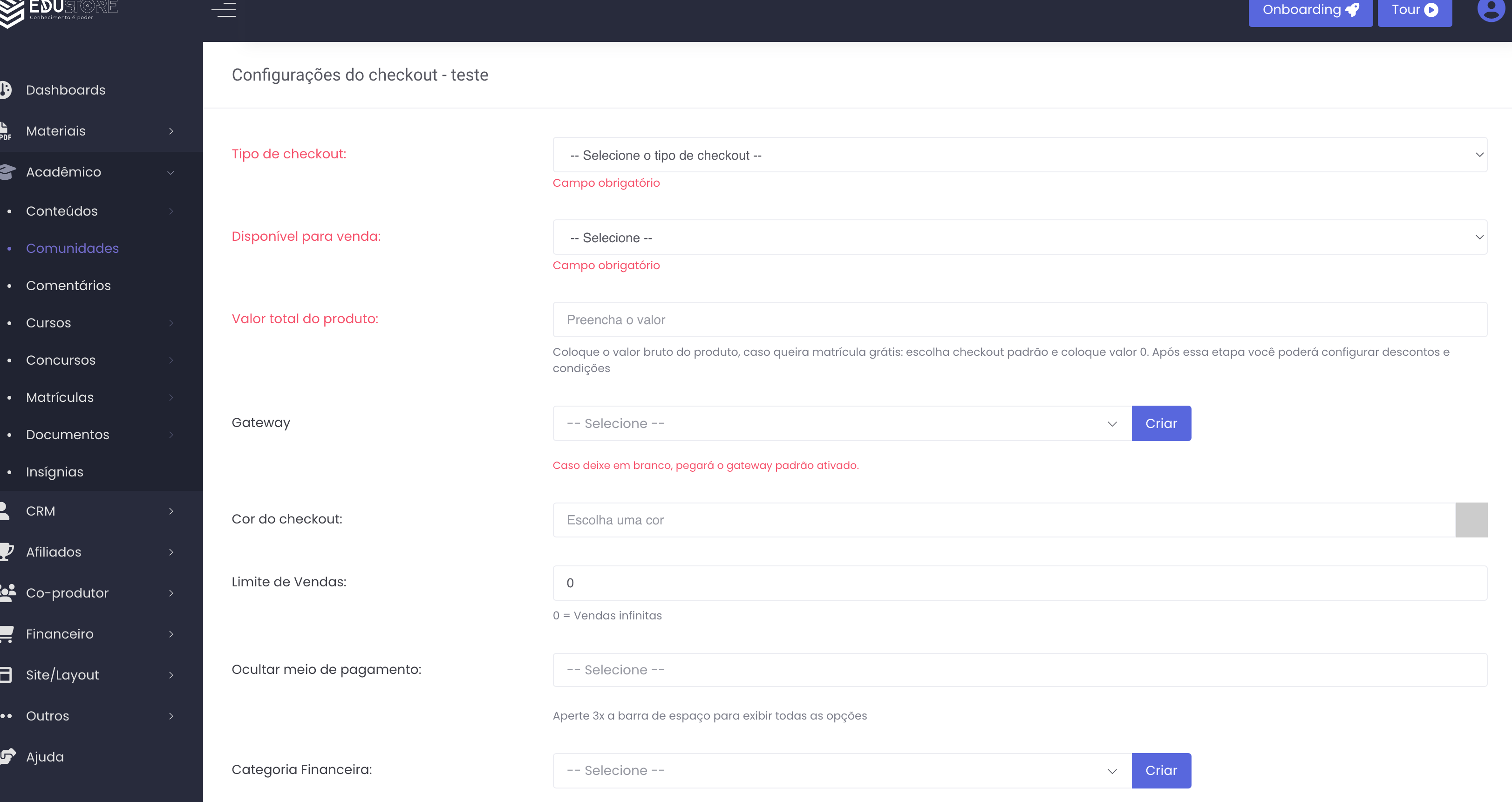 A configuração do checkout permite personalizar o processo de venda de uma comunidade de maneira eficiente e intuitiva. Abaixo estão as descrições de cada campo, destacando os obrigatórios em vermelho: