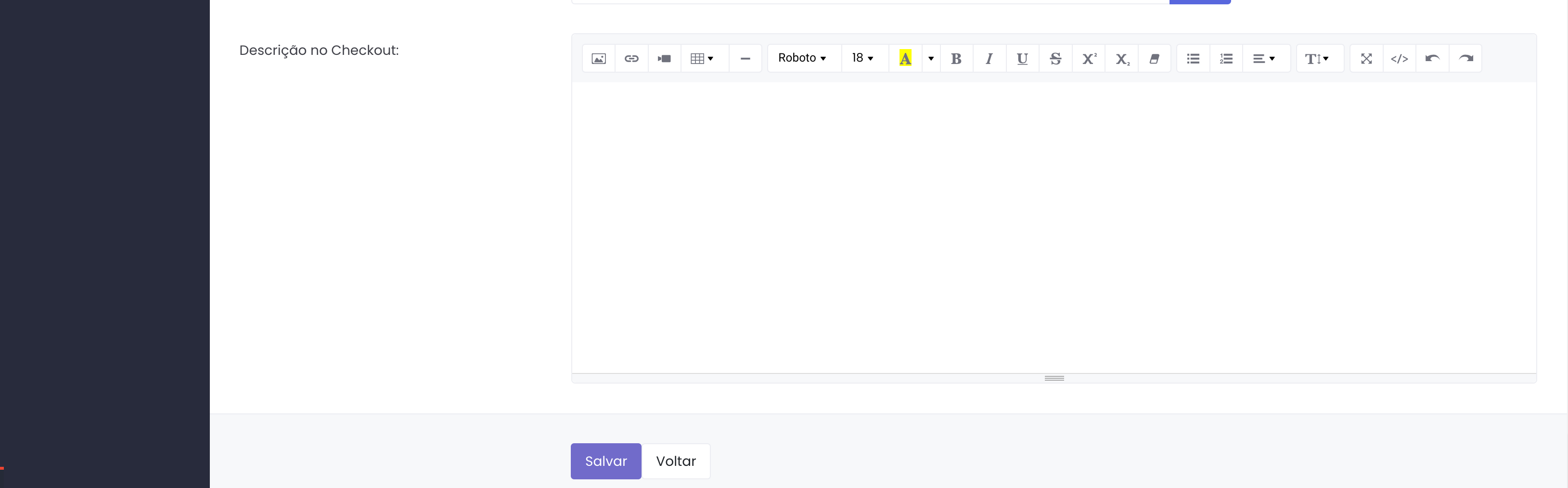 Insira informações adicionais ou instruções que serão exibidas para o usuário na página de checkout. Este campo suporta formatação rica, permitindo o uso de negrito, listas e até imagens.
