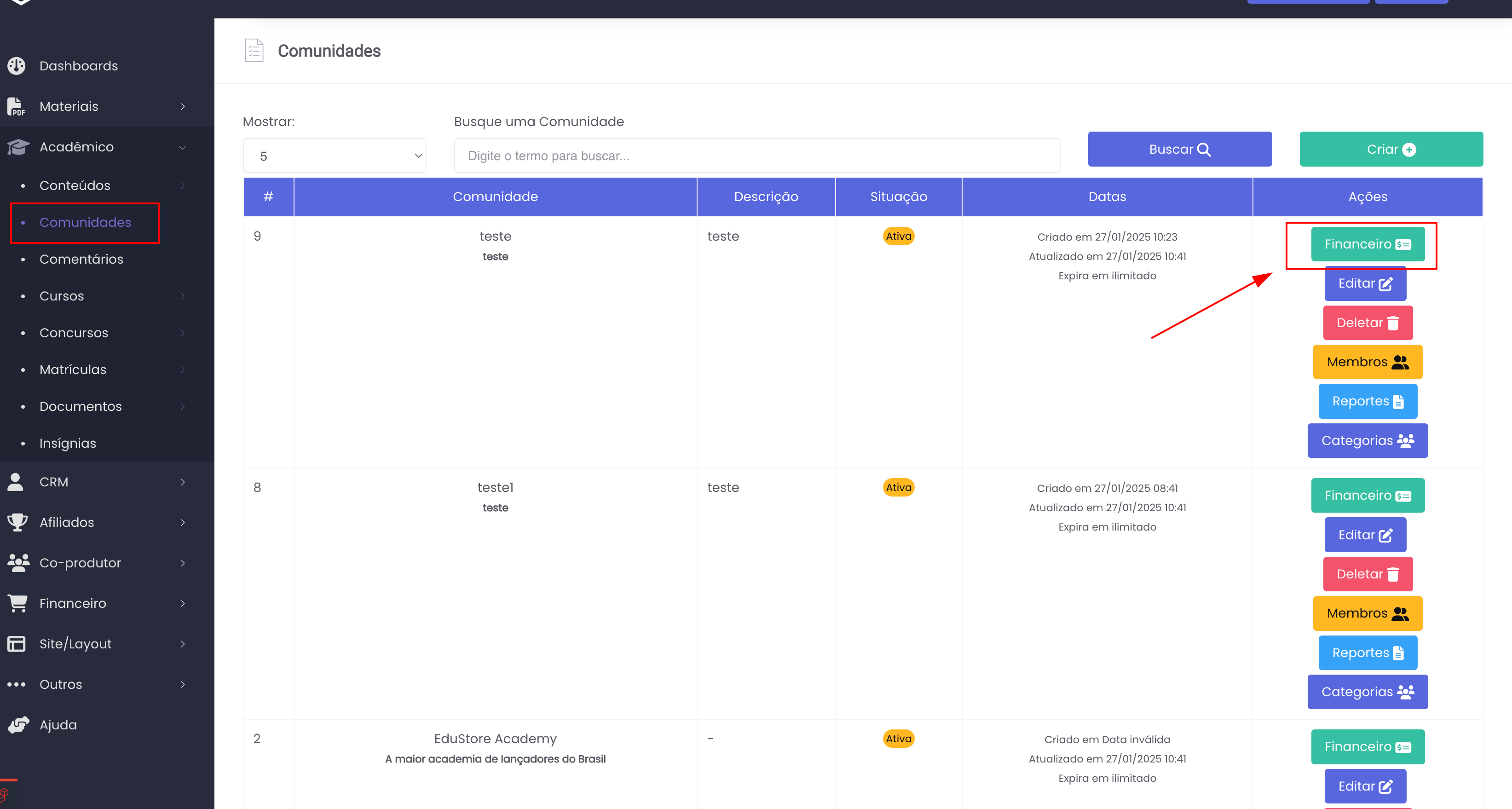 A seção de Financeiro permite configurar todos os detalhes relacionados à parte financeira e ao processo de venda das comunidades na plataforma.