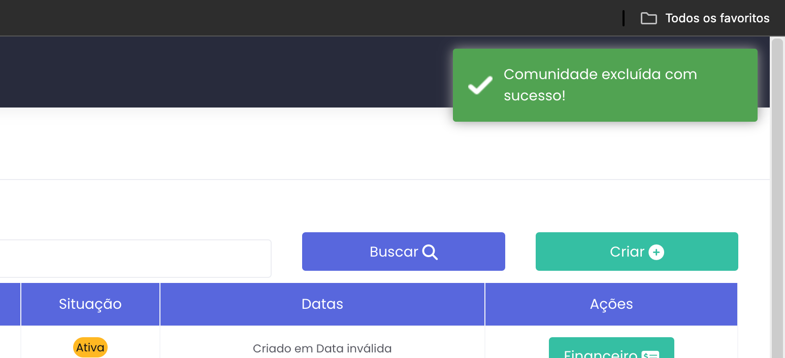 Após a confirmação, irá aparecer uma mensagem Comunidade Excluída com sucesso! , caso tudo ocorra certo.