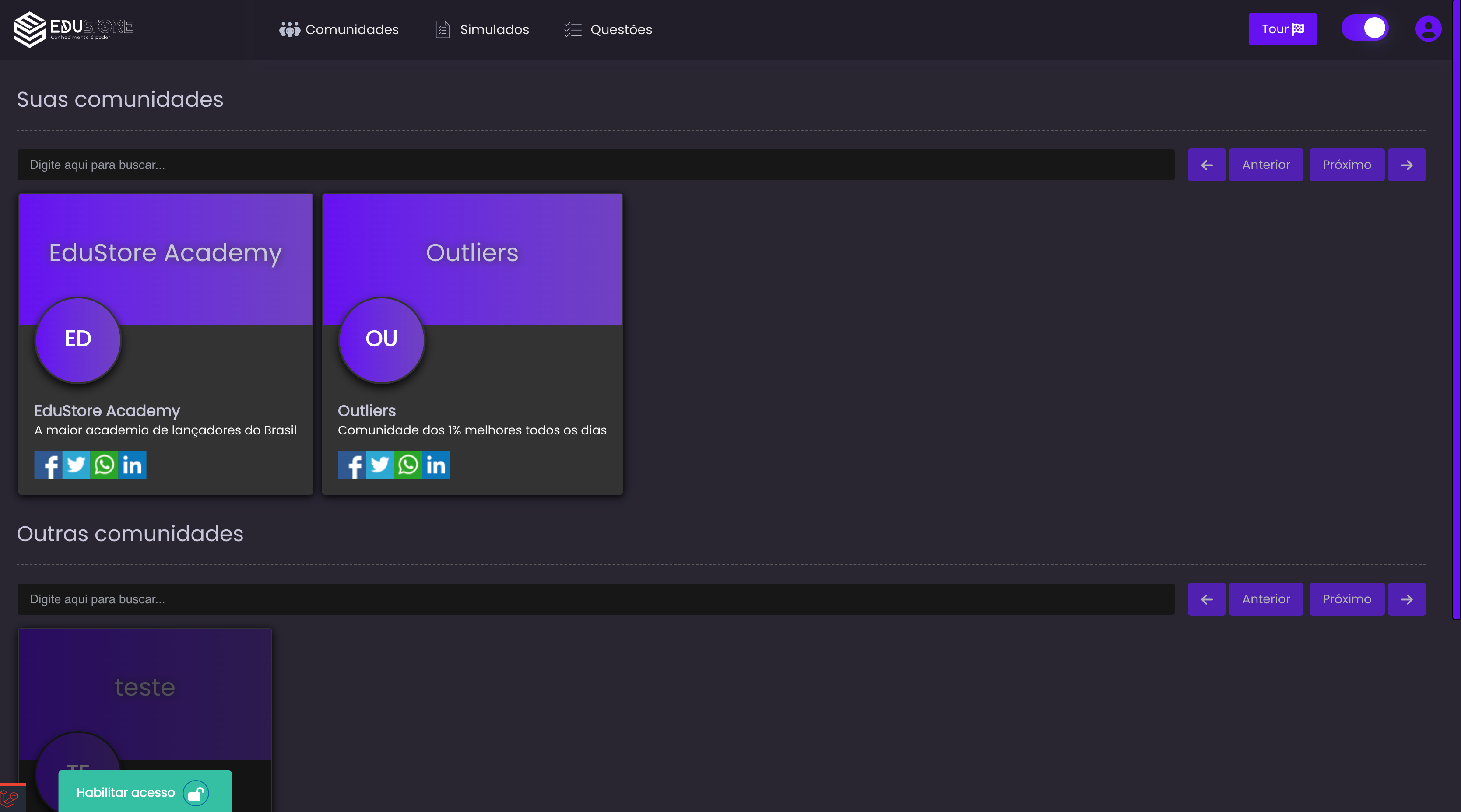- Abaixo dessa seção, haverá uma lista de Outras Comunidades, que ainda não estão habilitadas pelo usuário. Caso o aluno opte por clicar em Habilitar Acesso em uma dessas comunidades, ela será movida para a parte superior, em Suas Comunidades, ficando disponível para acesso imediato.