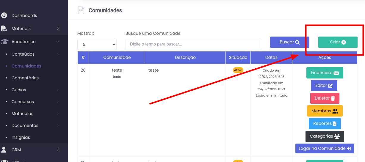 Para cadastrar uma comunidade, em Acadêmico->Comunidades->Criar(+):