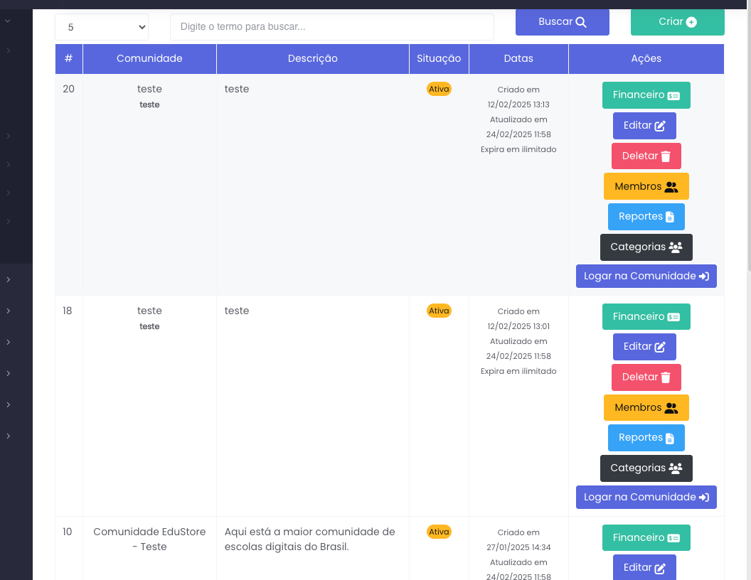 - Ações: Conjunto de opções disponíveis para gerenciamento da comunidade (detalhado em outra seção da documentação).