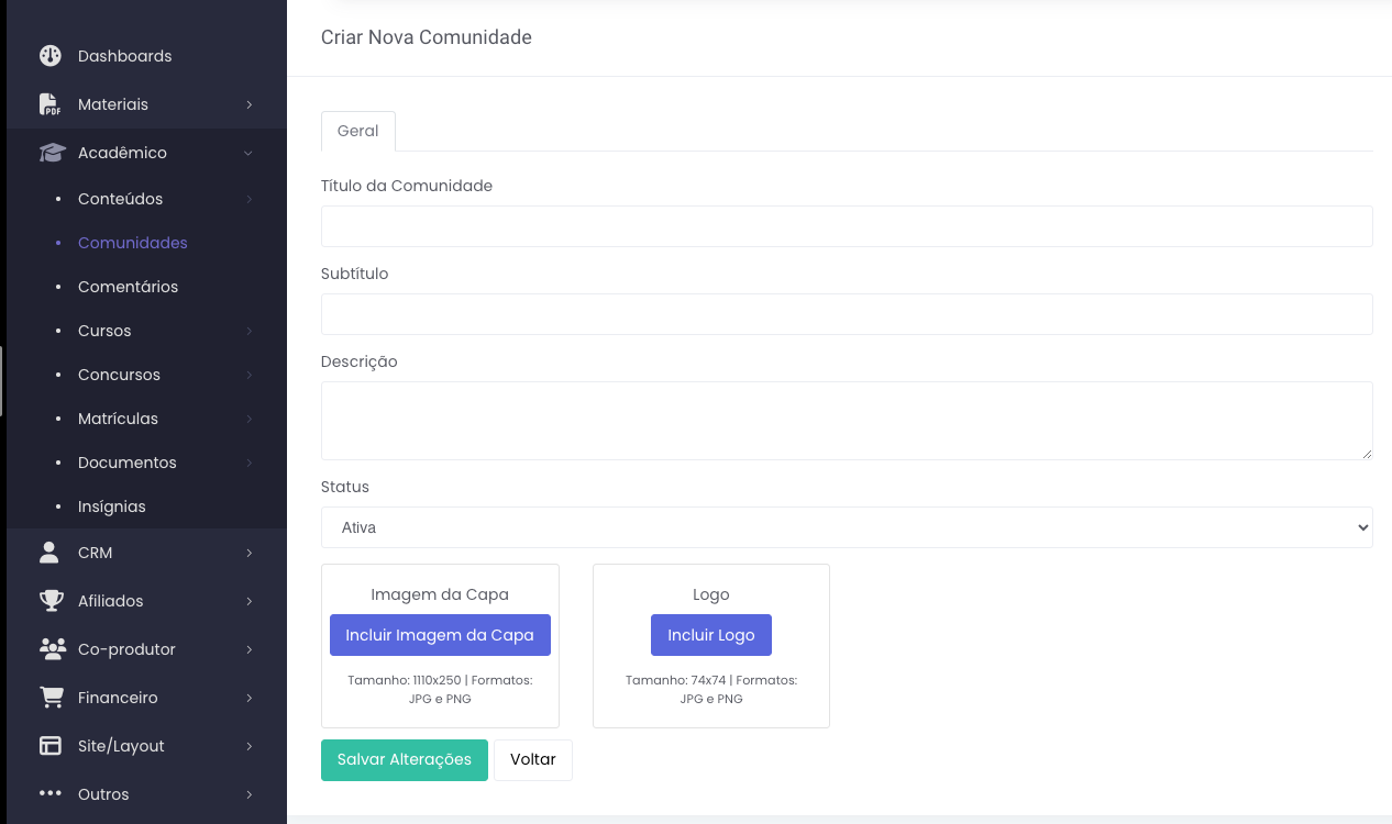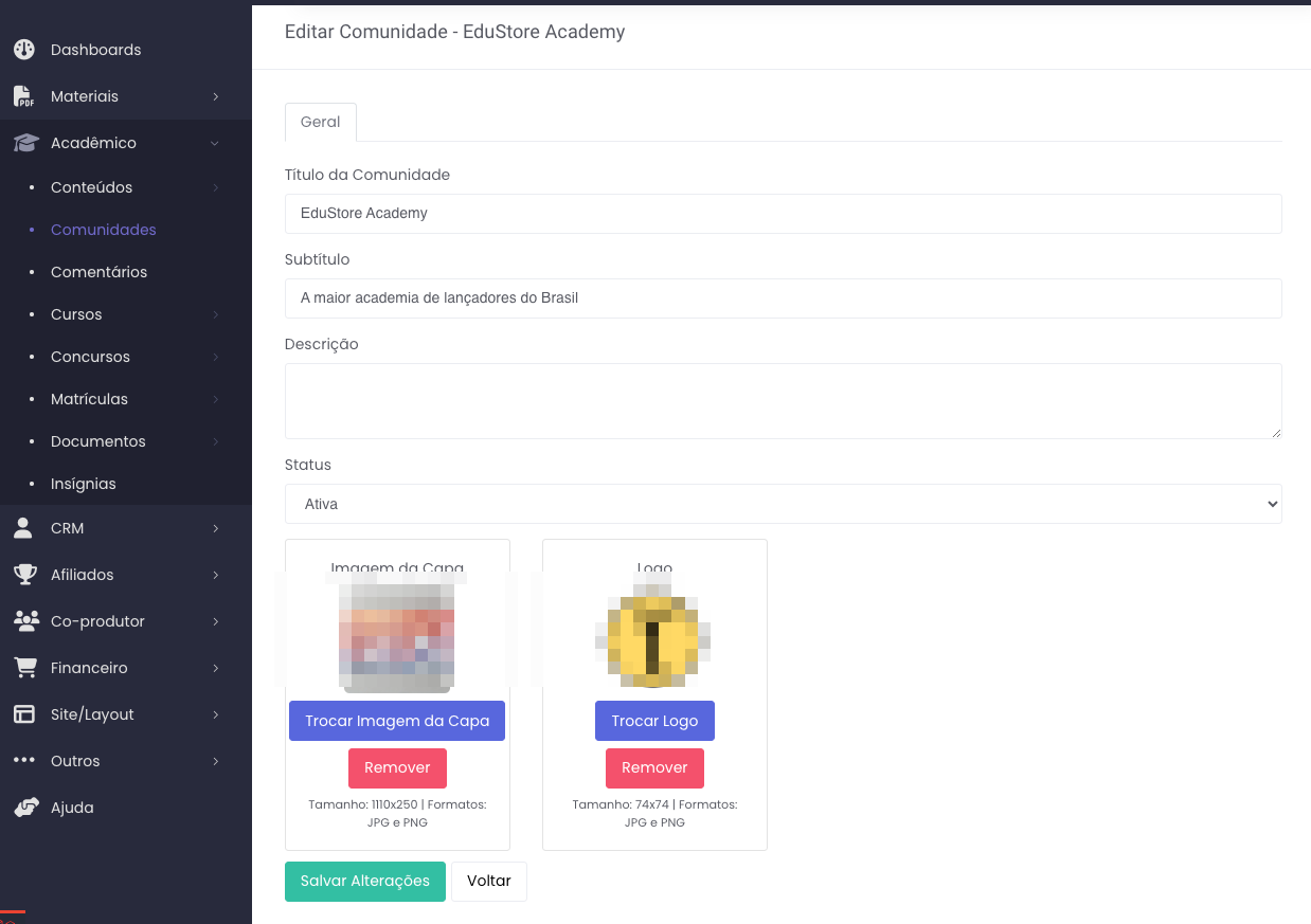 Ao executar a ação de editar uma comunidade específica, serão exibidos os campos que podem ser alterados. Caso já exista uma capa ou logo associada, será possível visualizar as imagens atuais, com opções para removê-las ou substituí-las, se necessário. Isso permite flexibilidade para atualizar informações e personalizar a comunidade conforme as necessidades.