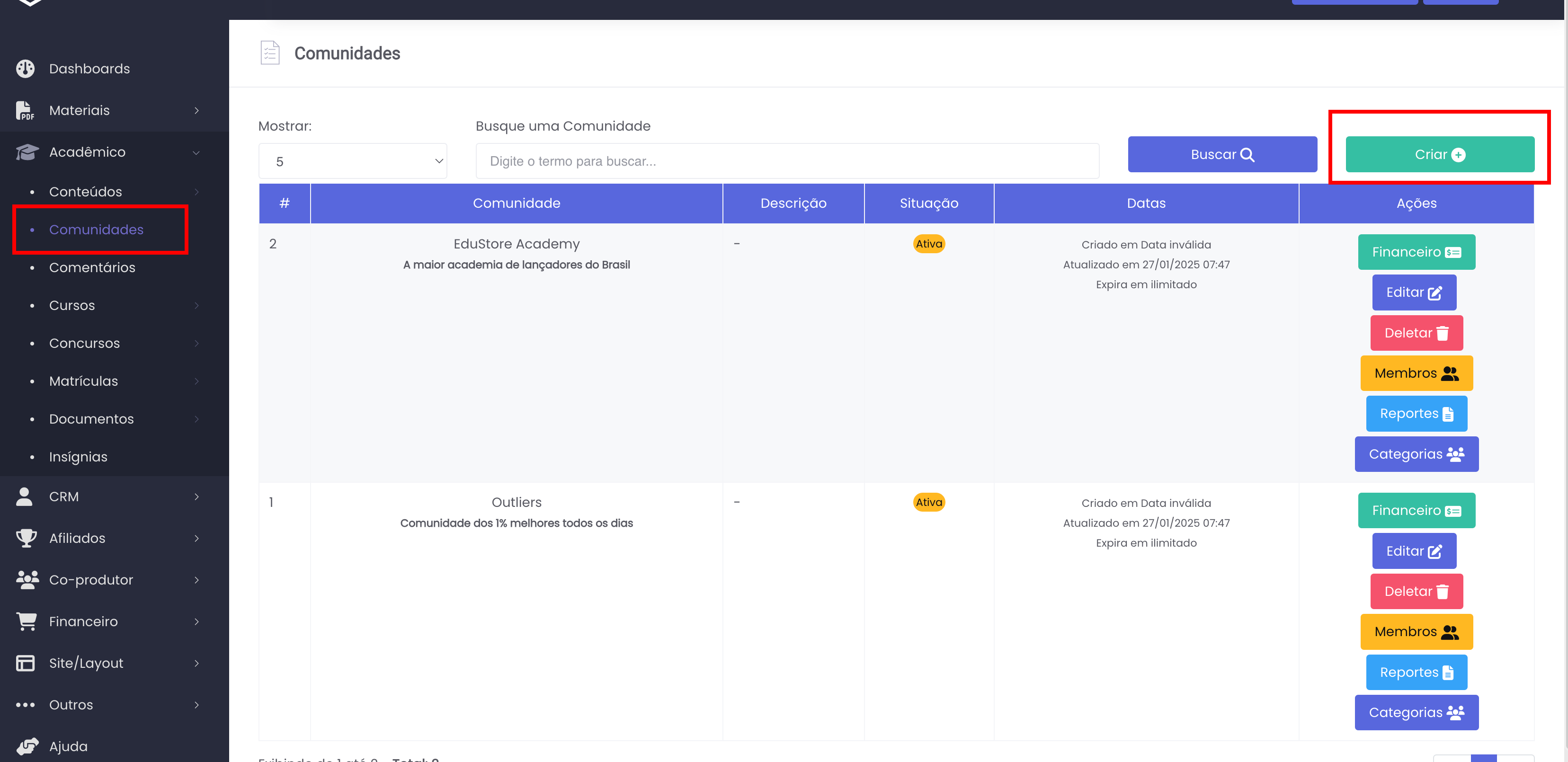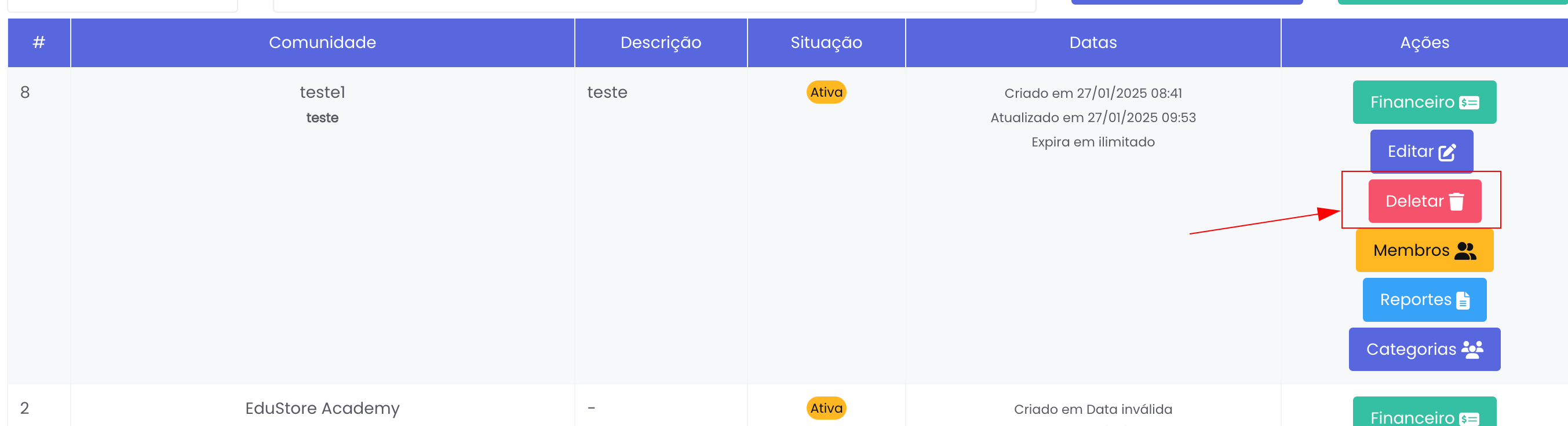 - Ações: Conjunto de opções disponíveis para gerenciamento da comunidade (detalhado em outra seção da documentação).