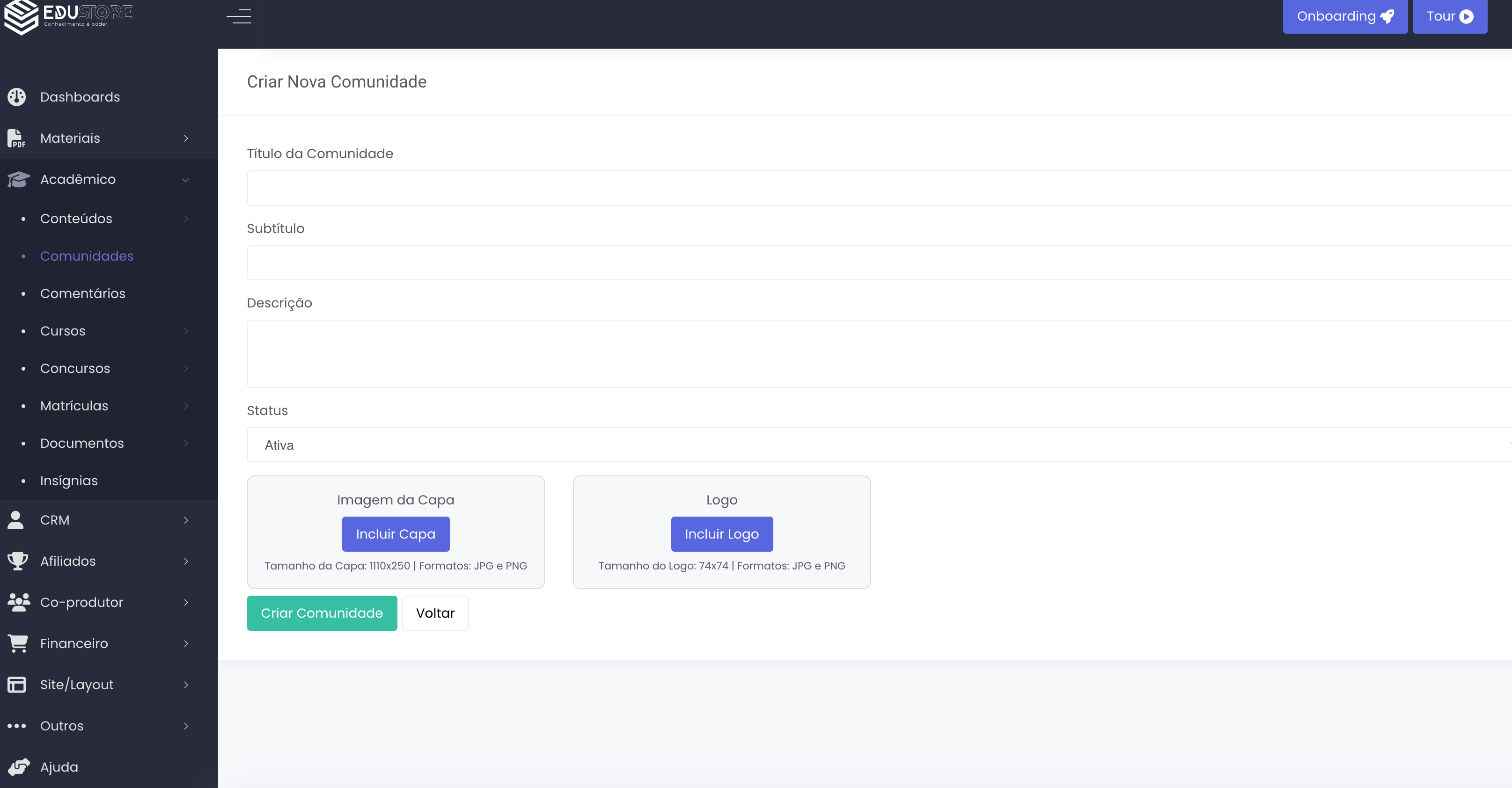 - Criar Comunidade: Finaliza e ativa a criação da comunidade com as configurações inseridas.