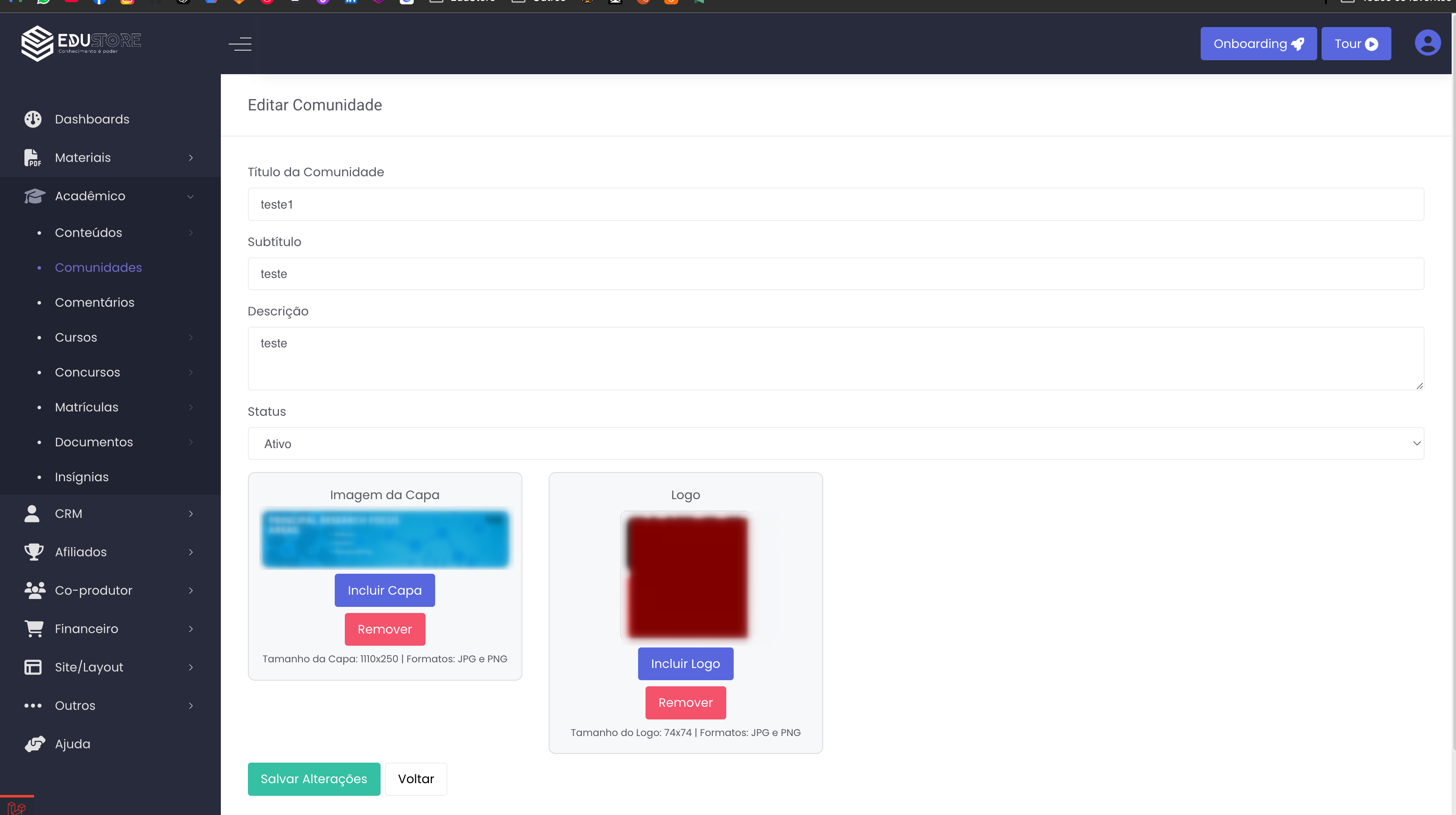 Ao executar a ação de editar uma comunidade específica, serão exibidos os campos que podem ser alterados. Caso já exista uma capa ou logo associada, será possível visualizar as imagens atuais, com opções para removê-las ou substituí-las, se necessário. Isso permite flexibilidade para atualizar informações e personalizar a comunidade conforme as necessidades.