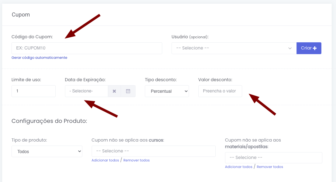 A plataforma permite controlar com precisão como o desconto será aplicado nos produtos vinculados a um cupom.