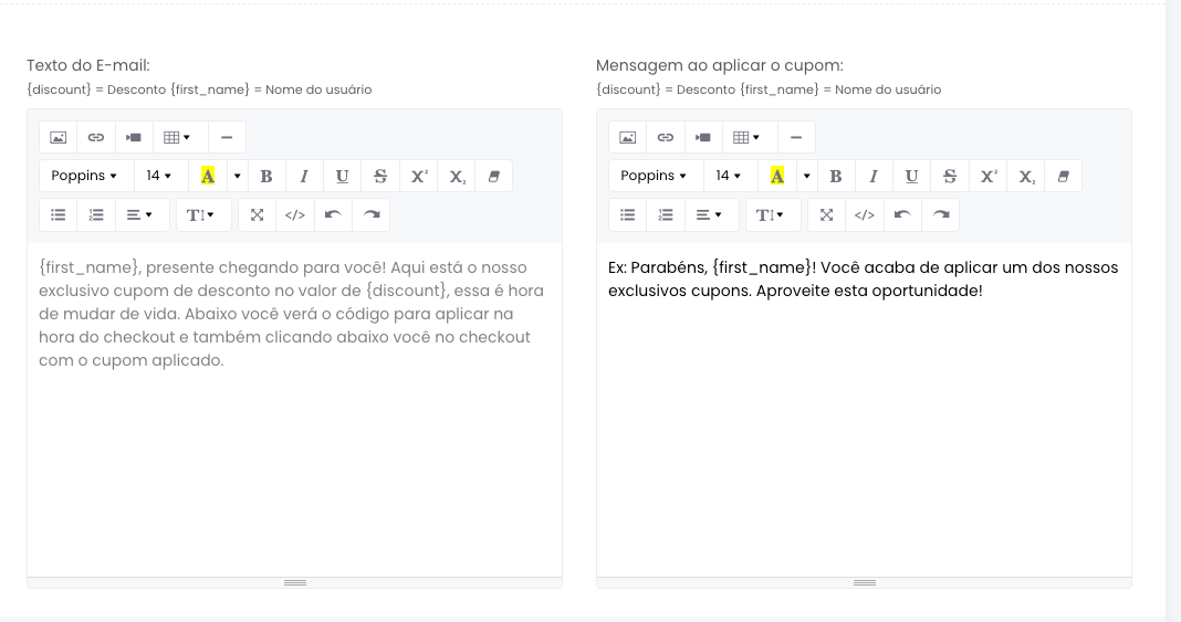 A Vocêplataforma podepermite personalizar tanto o texto do e-mail enviado quanto a mensagem que apareceráexibida ao aplicar o cupom,cupom.