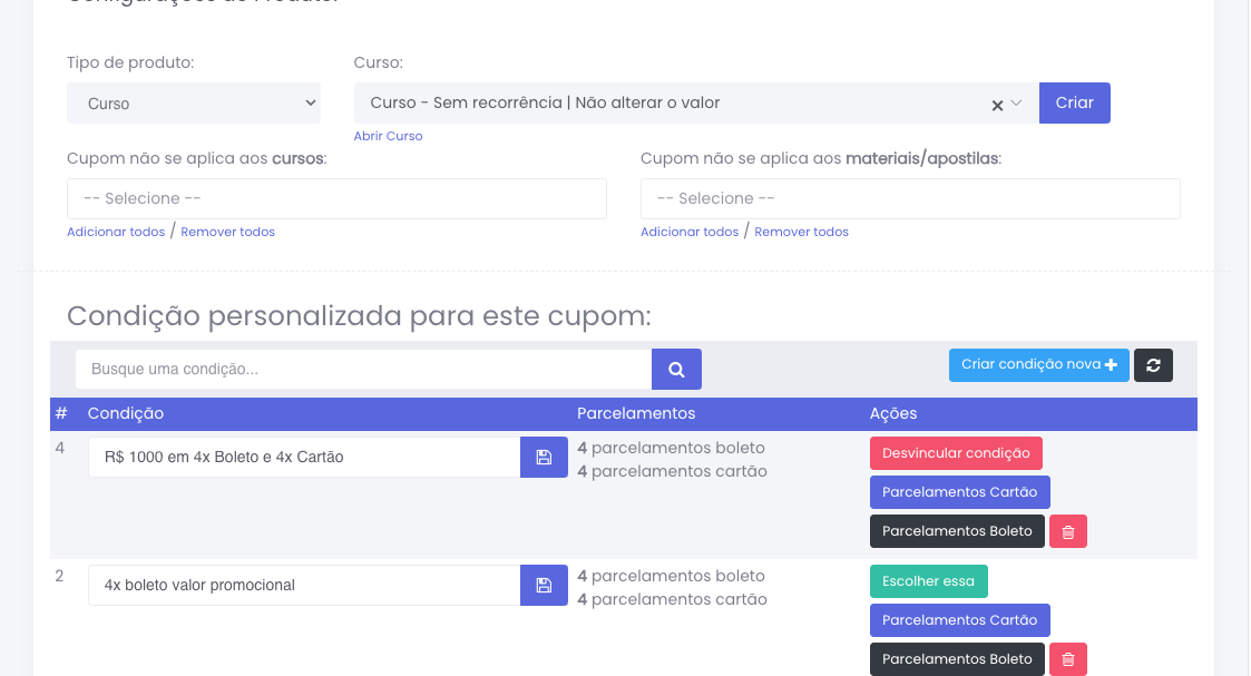 selecionarsegueoatipo de produto = Curso e escolher um condiçconfiguraçãopagamentoglobal(BoletodaParcelado ou CartãseçãoRecorrente)Desconto Padrão. -