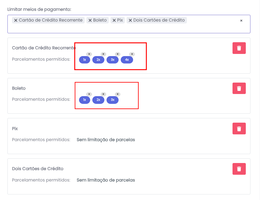 Para remover um meio de pagamento inteiro, clique no botão vermelho com ícone de lixeira à direita do bloco.