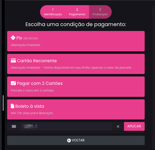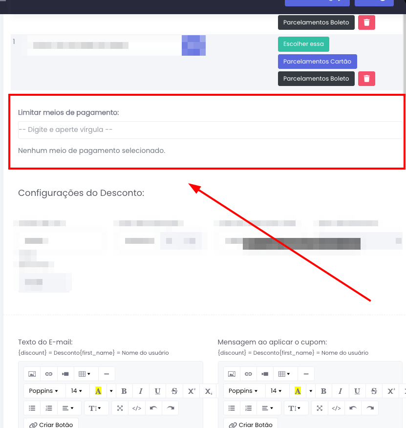 Cupom: Limitação de meios de pagamentos e parcelas