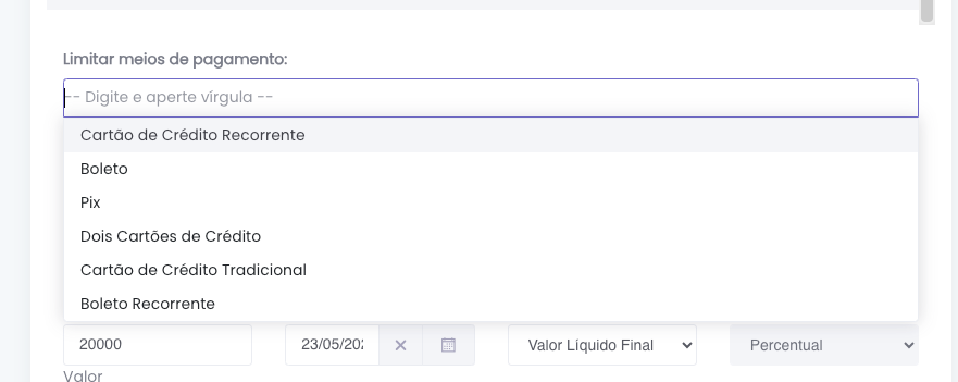 Ao clicarmos no campo, ou digitarmos algo, vai aparecer os meios de pagamentos que são utilizados no checkout da plataforma.