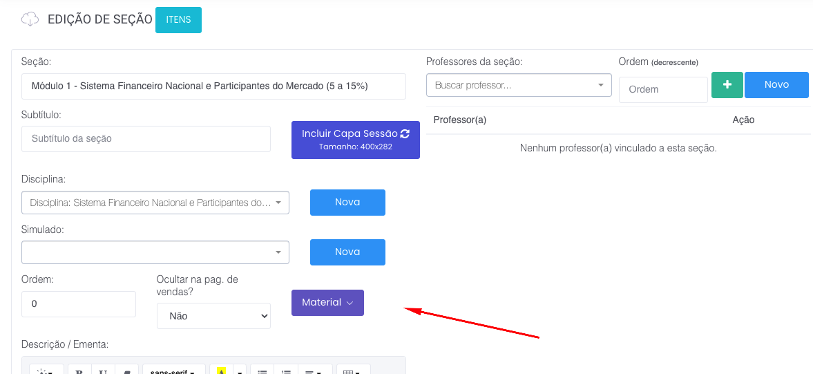 Ao editar uma sessão você verá um botão Material, basta subir seus materiais utilizando esse botão, você também consegue atribuir a ordem dos materiais (ordem decrescente).