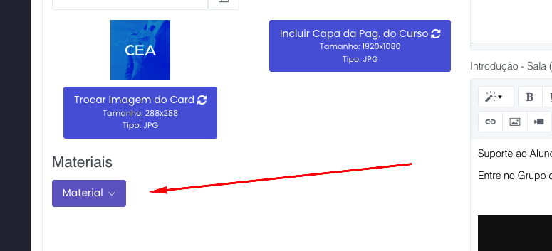 Ao editar um curso você verá um botão Material, basta subir seus materiais utilizando esse botão, você também consegue atribuir a ordem dos materiais (ordem decrescente).