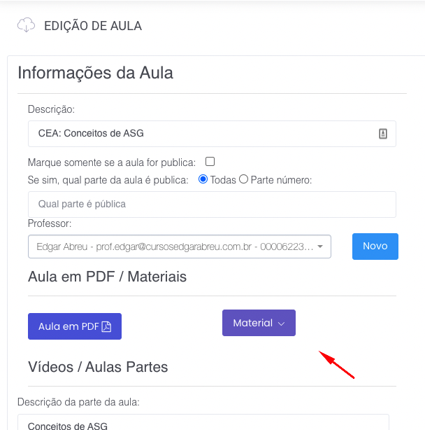 OBS: o botão Aula em PDF é especificamente para subir um PDF da aula, lembrando que a opção Material é para subir materiais complementares da aula e o Aula em PDF é para a aula transcrita em PDF.