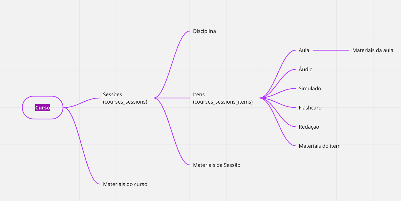 A estrutura é composta de uma entidade principal chamada Curso, dentro de um curso você possui módulos (sessões), esses módulos podem estar vinculados a disciplinas para uso futuro e cruzamento de dados como Questões, Assuntos, Flashcards…