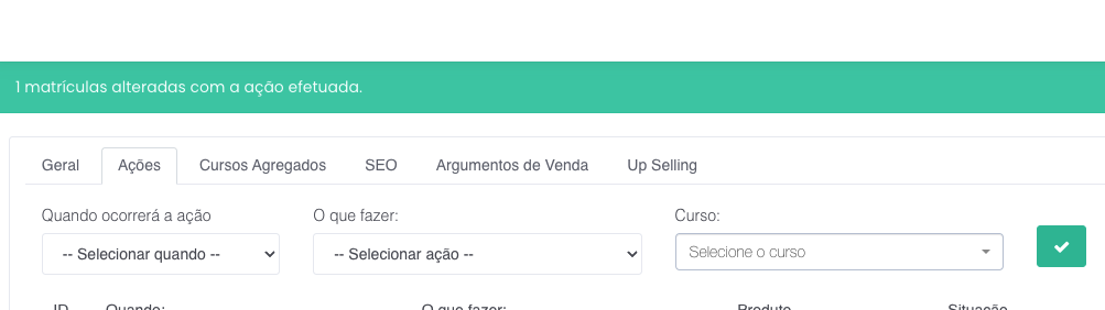 O produto ação é uma funcionalidade pensada para efetuar ações quando algo acontece a um produto (curso).