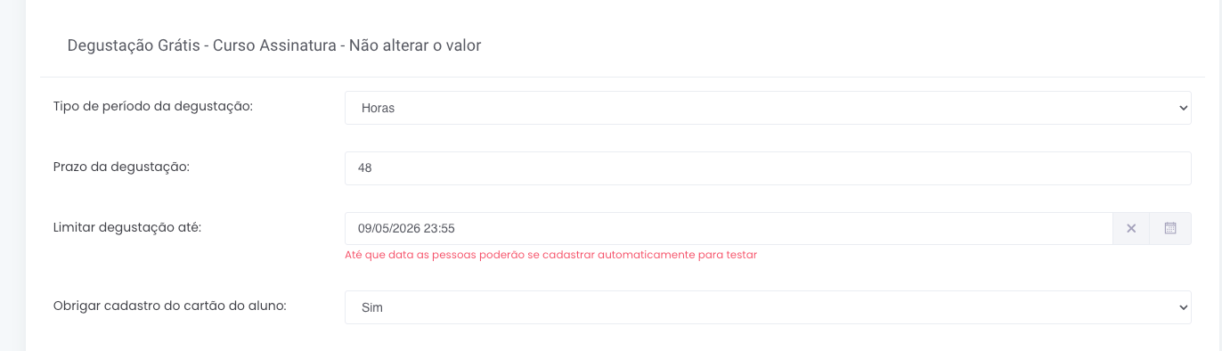 O último campo e mais importante: obrigar cadastro de cartão de crédito, ao obrigar o cadastro de cartão, ele fará o débito automático após o período de assinatura, caso contrário a degustação apenas irá vencer.